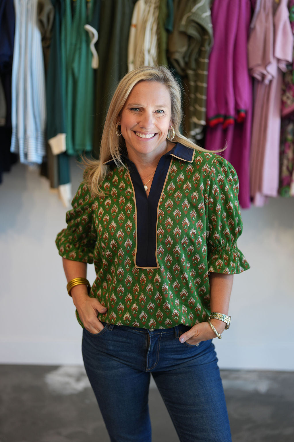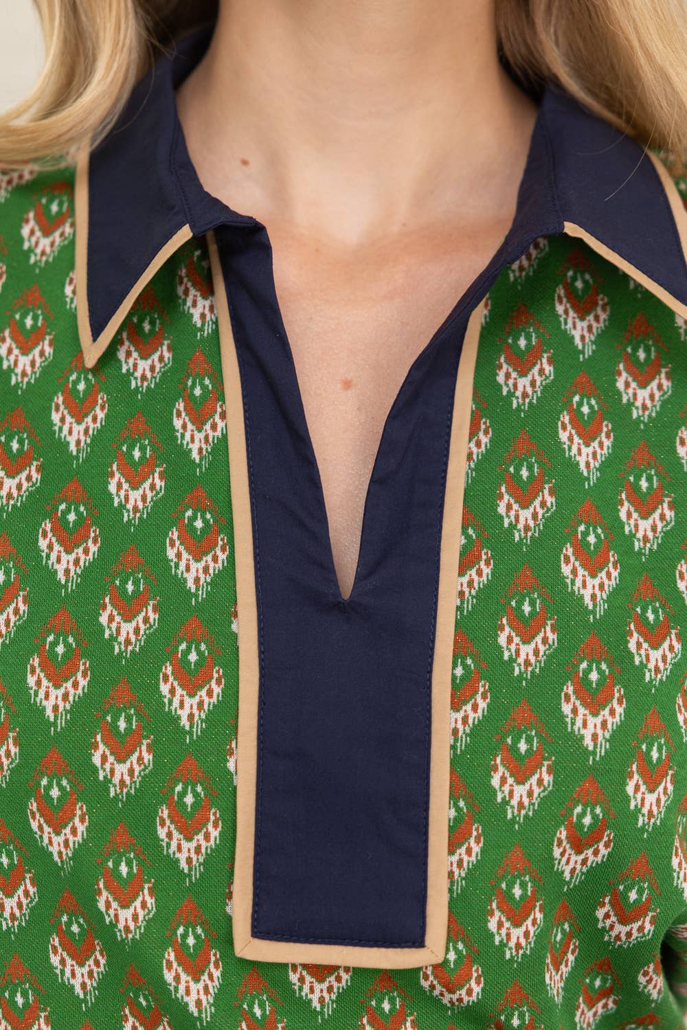 This green printed blouse features a bold geometric pattern with a contrast navy collar and neckline trim.