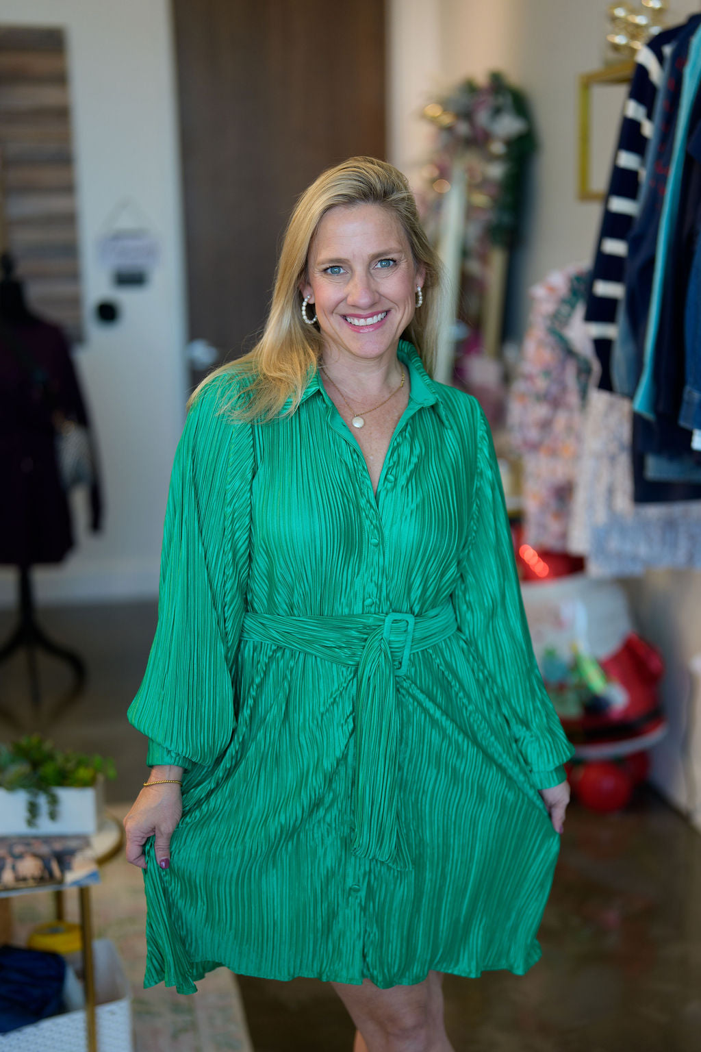 A solid woven mini dress featuring fully pleated, shirt collar, button down and self sash tie Details Self : 100% Polyester Lining : 100% Polyester Size & Fit -