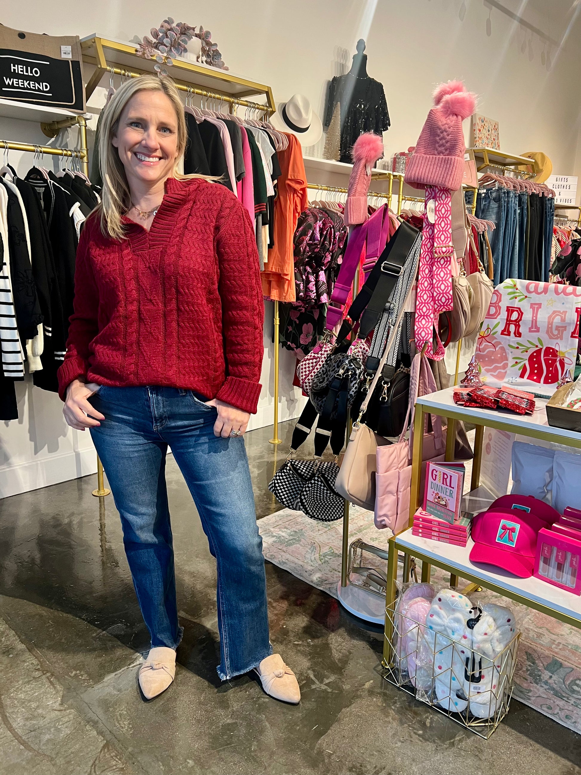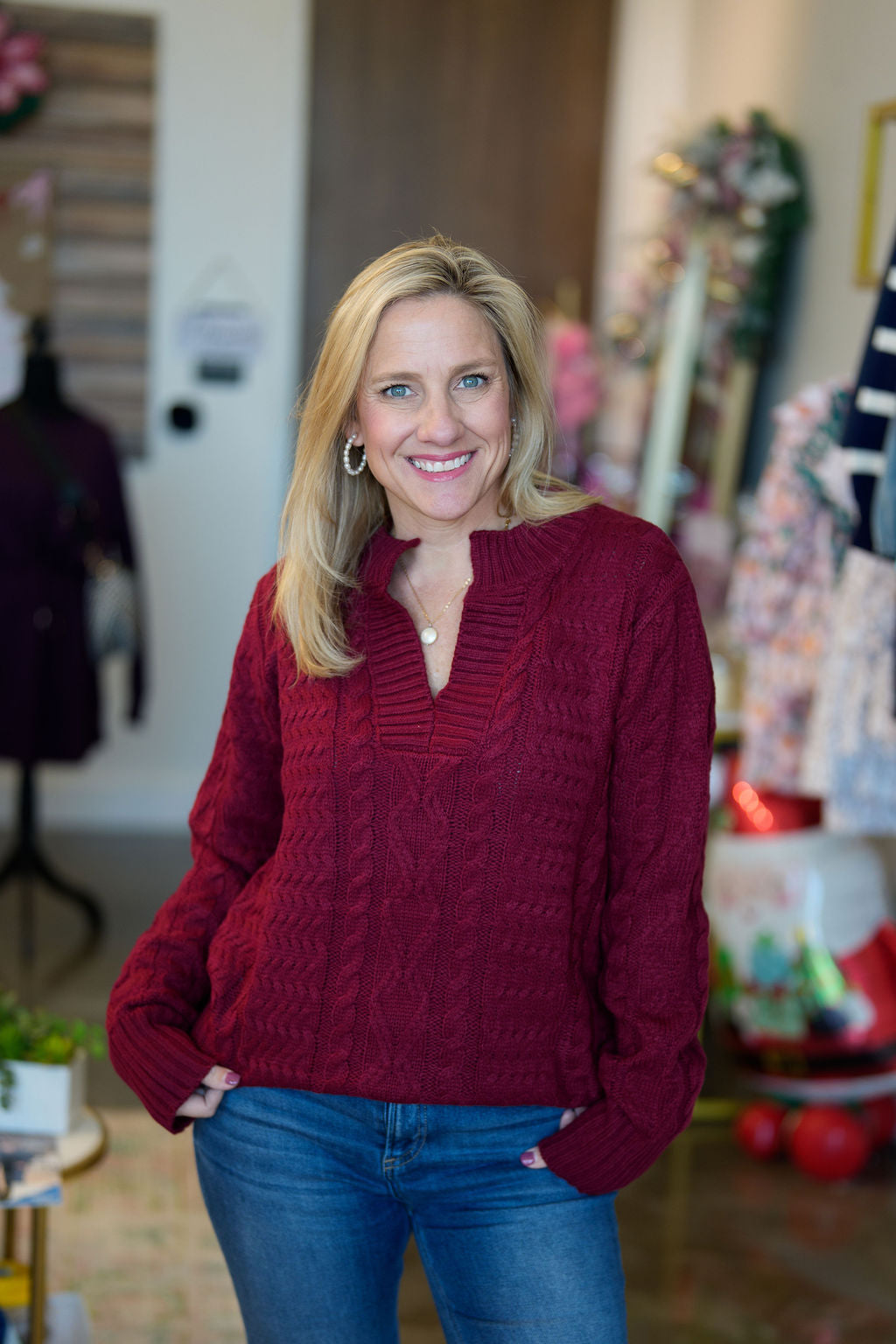 - Notched ribbed V-neck women's knitted sweater - Cable embellishment accent - Long-sleeve ribbed hem - Stretch knit material - Pullover style - Lightweight and breathable for spring and fall winter casual wear -