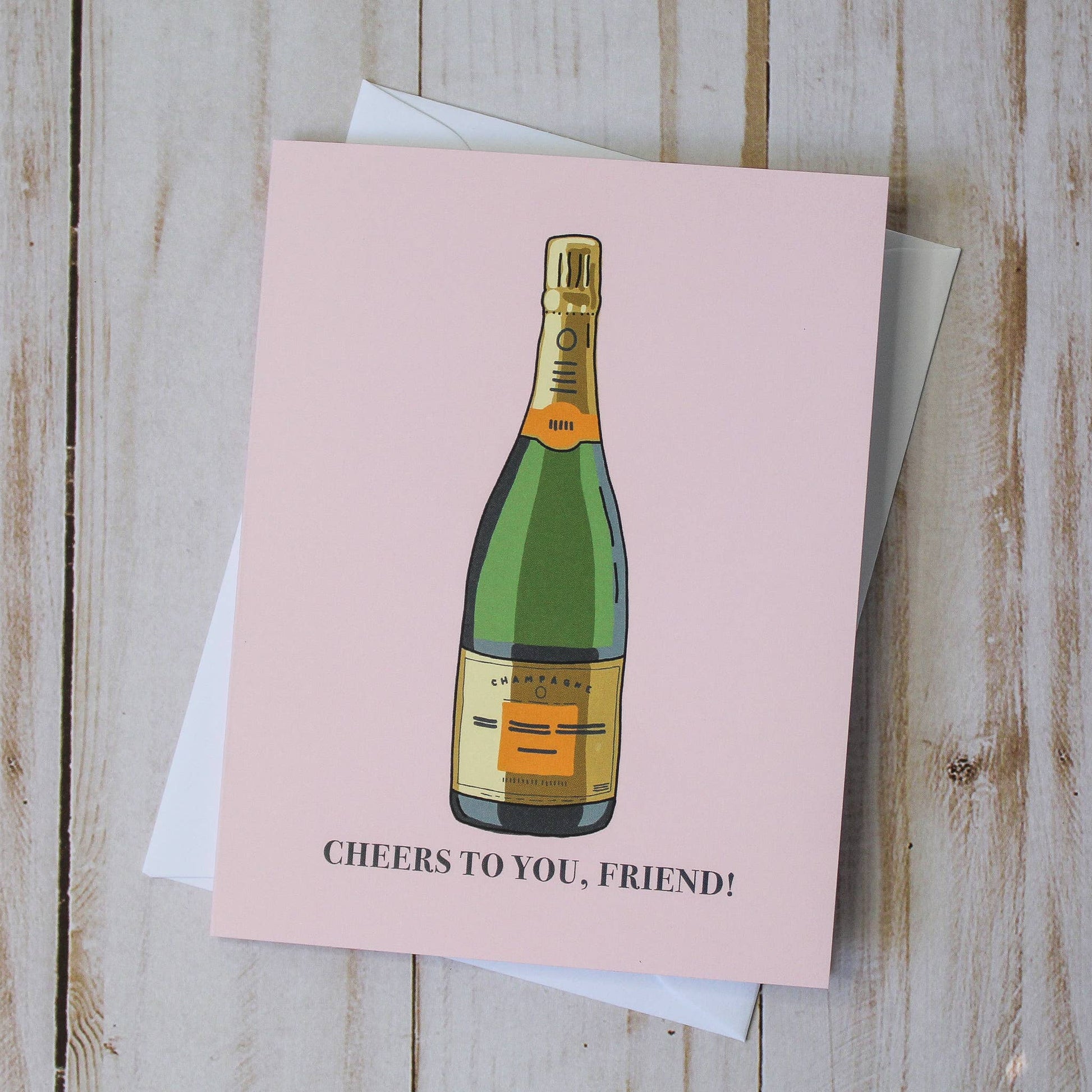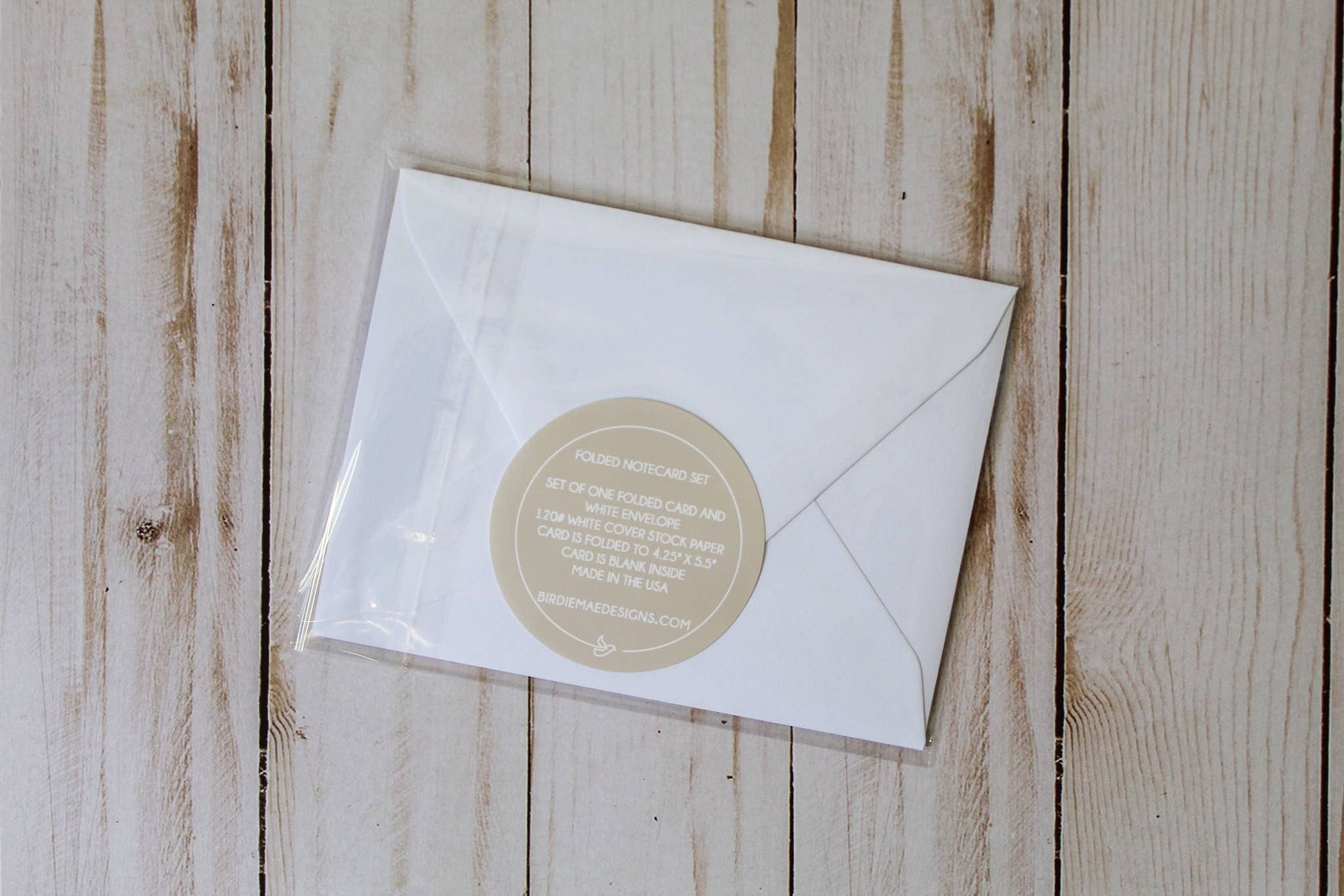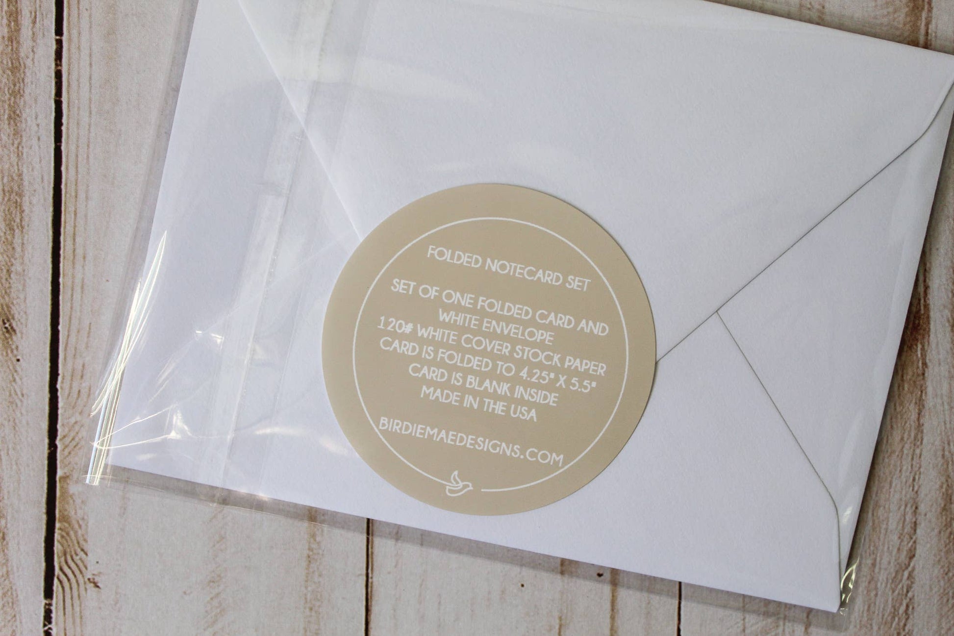 Our "Cheers to you, Friend!" card is perfect for a celebration or just because! Each card is folded to 4.25" tall by 5.5" wide, is blank inside and comes with a matching white envelope. Cards are packaged in cellophane sleeves.