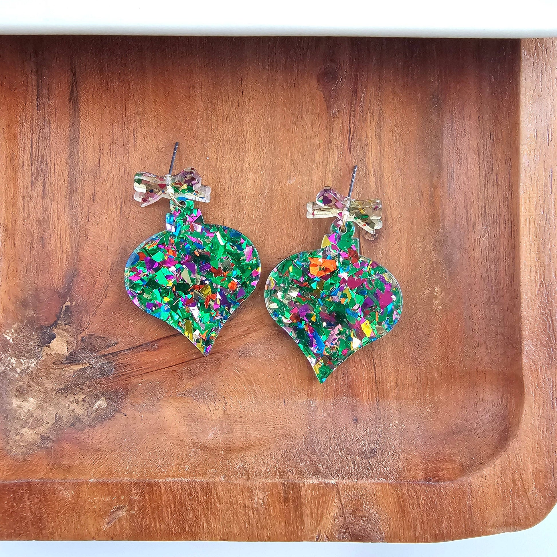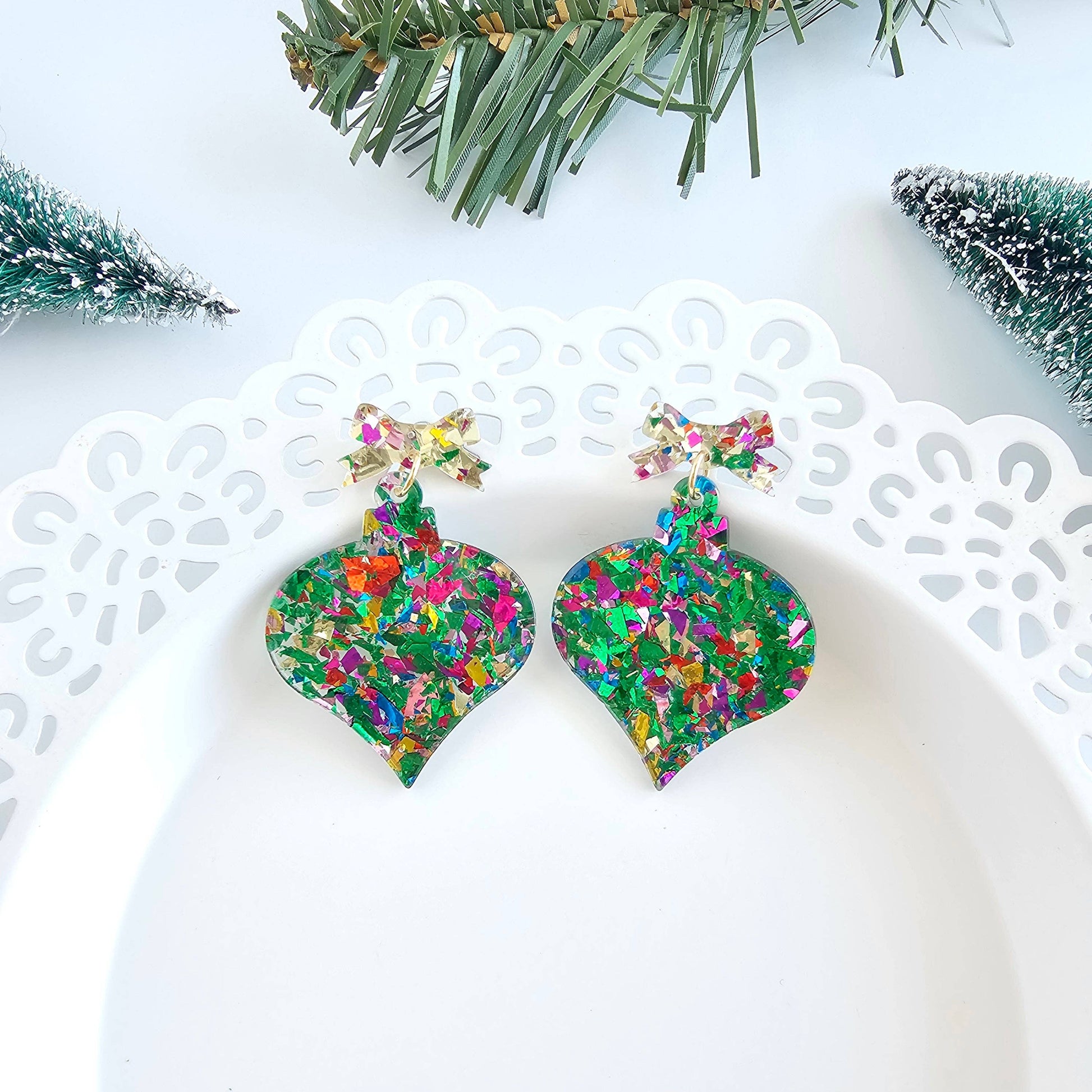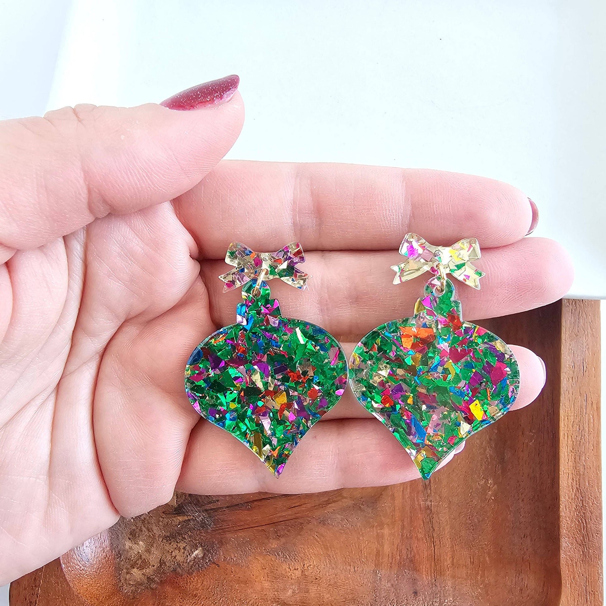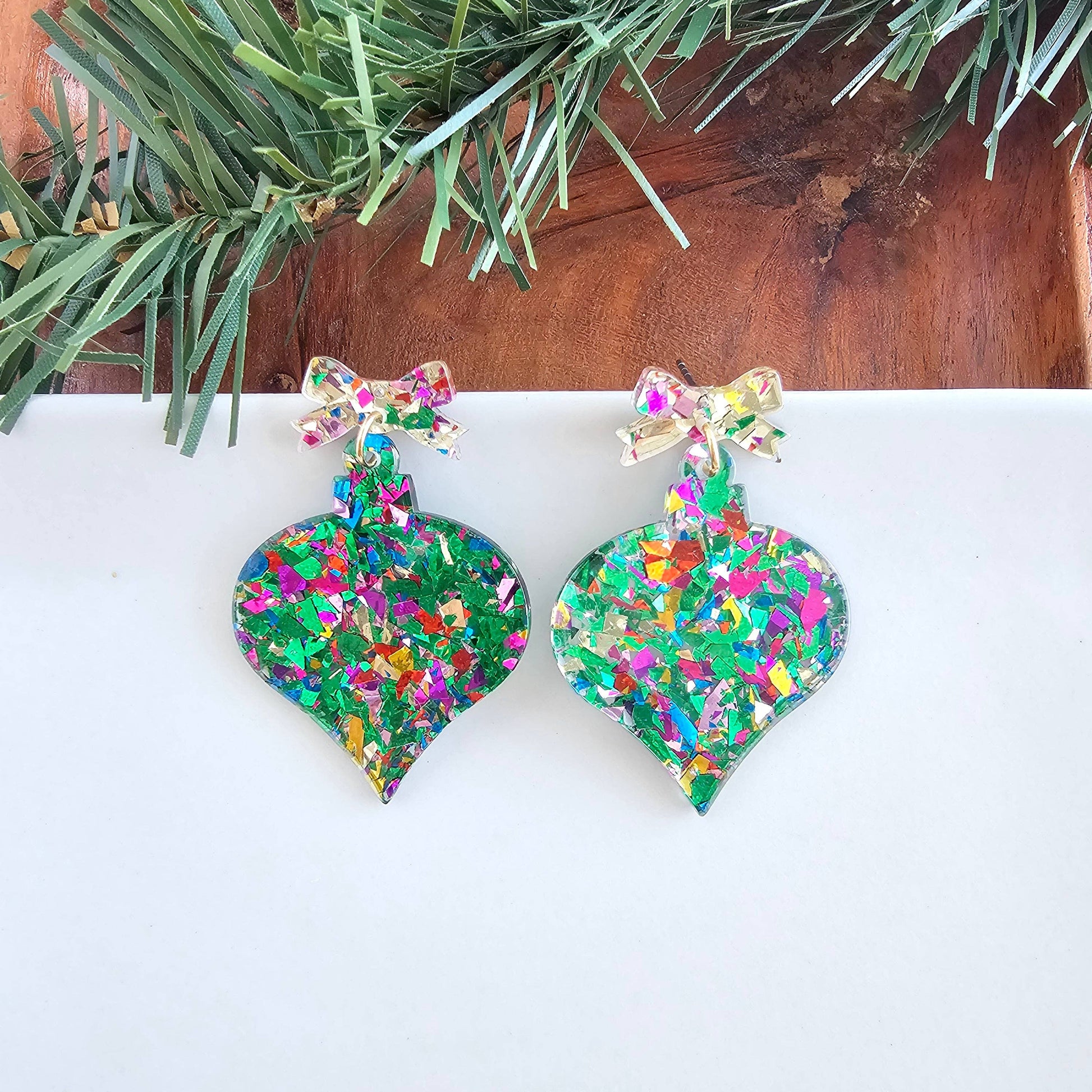 This holiday season, let your style be merry and bright with our sparkly confetti Christmas Ornament Earrings. Add a touch of sparkle to your festivities and embrace the joy of the season! 🎉🌟❄️ Our Christmas Ornaments come in three different colors and vintage-inspired shapes, adorned with a bow on top! * Hypoallergenic stainless steel posts * Lightweight acrylic