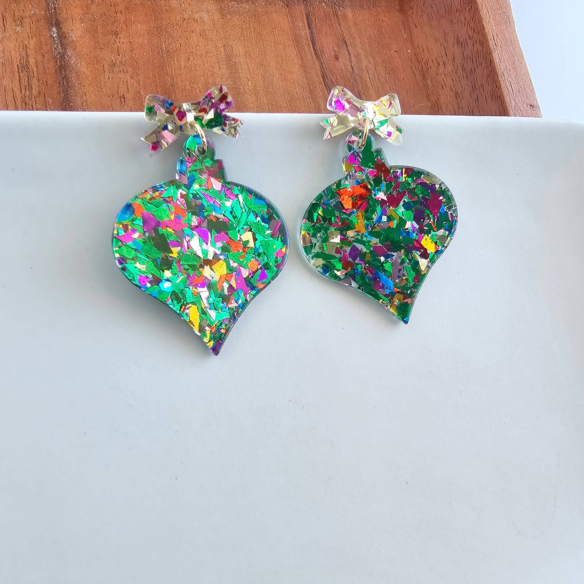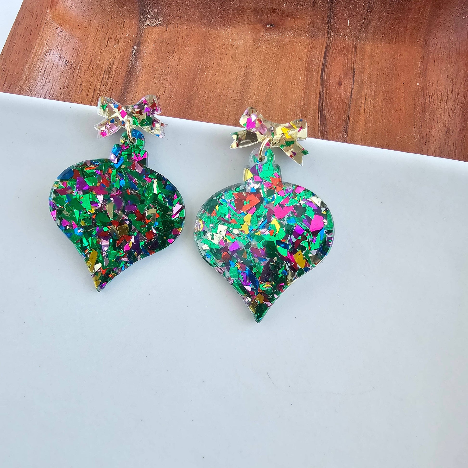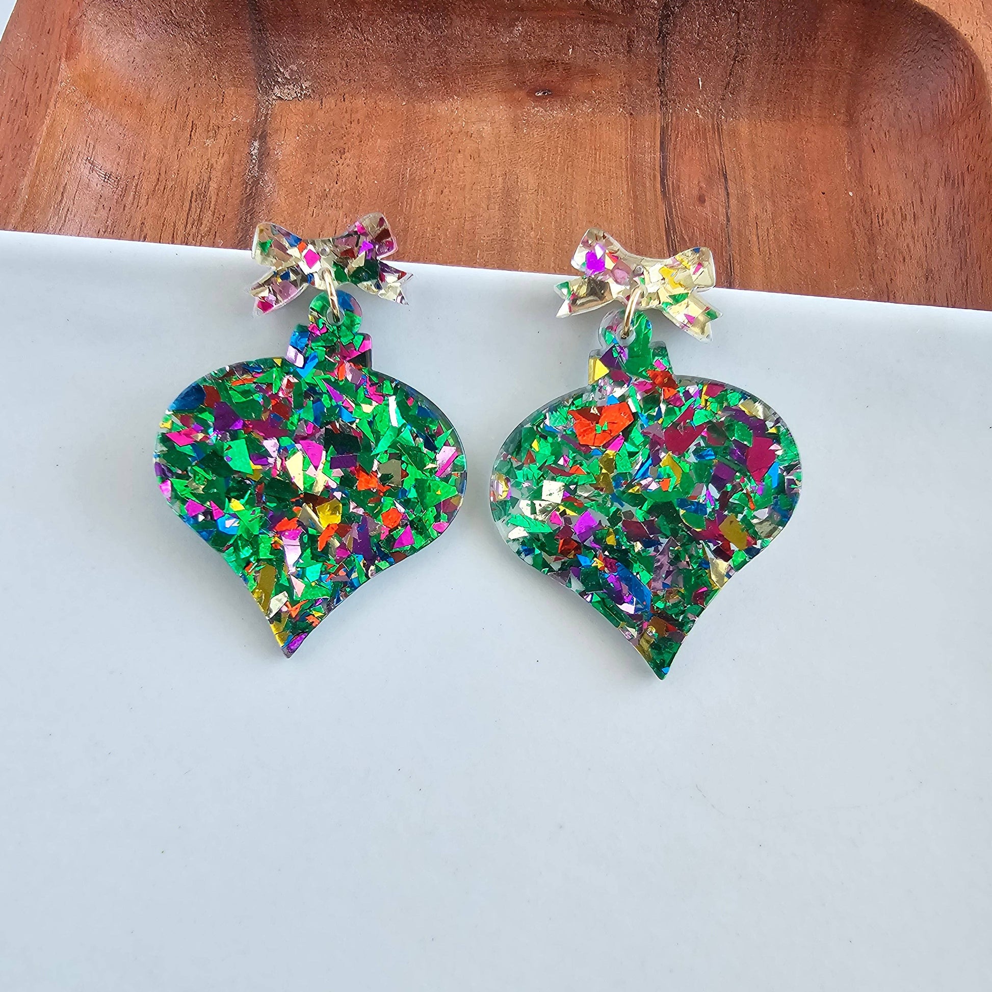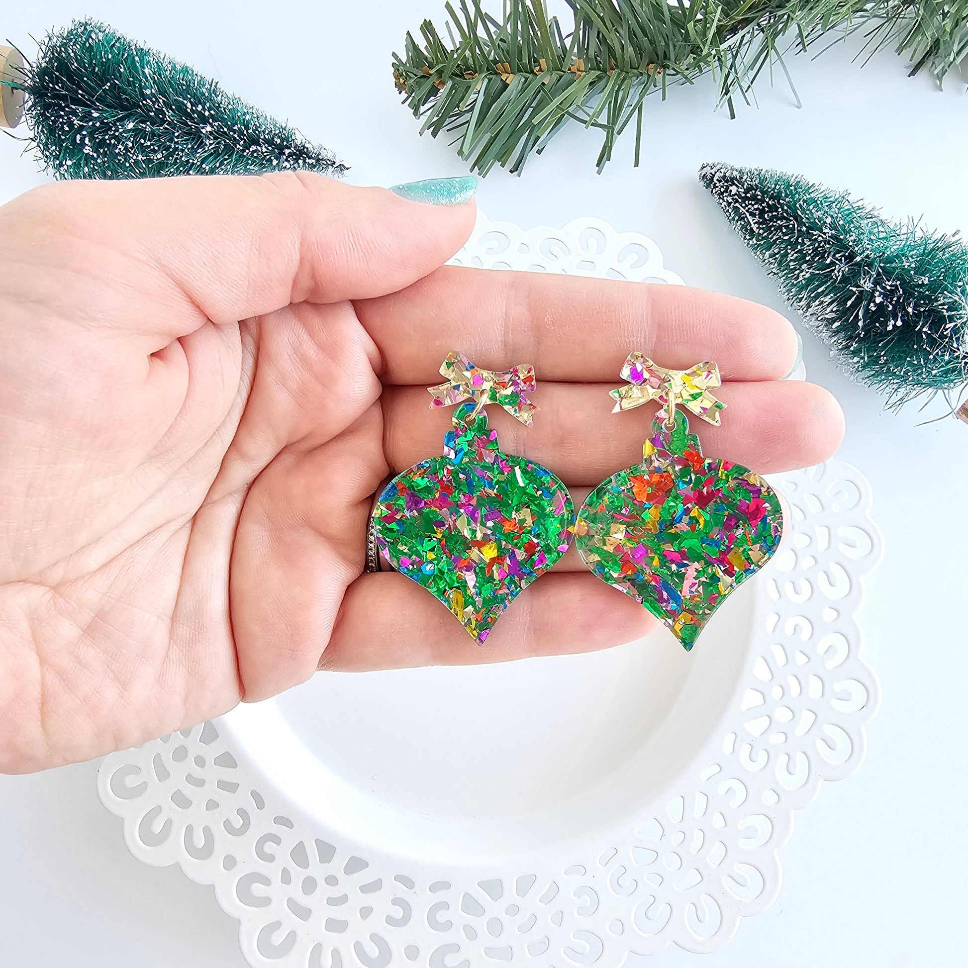 This holiday season, let your style be merry and bright with our sparkly confetti Christmas Ornament Earrings. Add a touch of sparkle to your festivities and embrace the joy of the season! 🎉🌟❄️ Our Christmas Ornaments come in three different colors and vintage-inspired shapes, adorned with a bow on top! * Hypoallergenic stainless steel posts * Lightweight acrylic