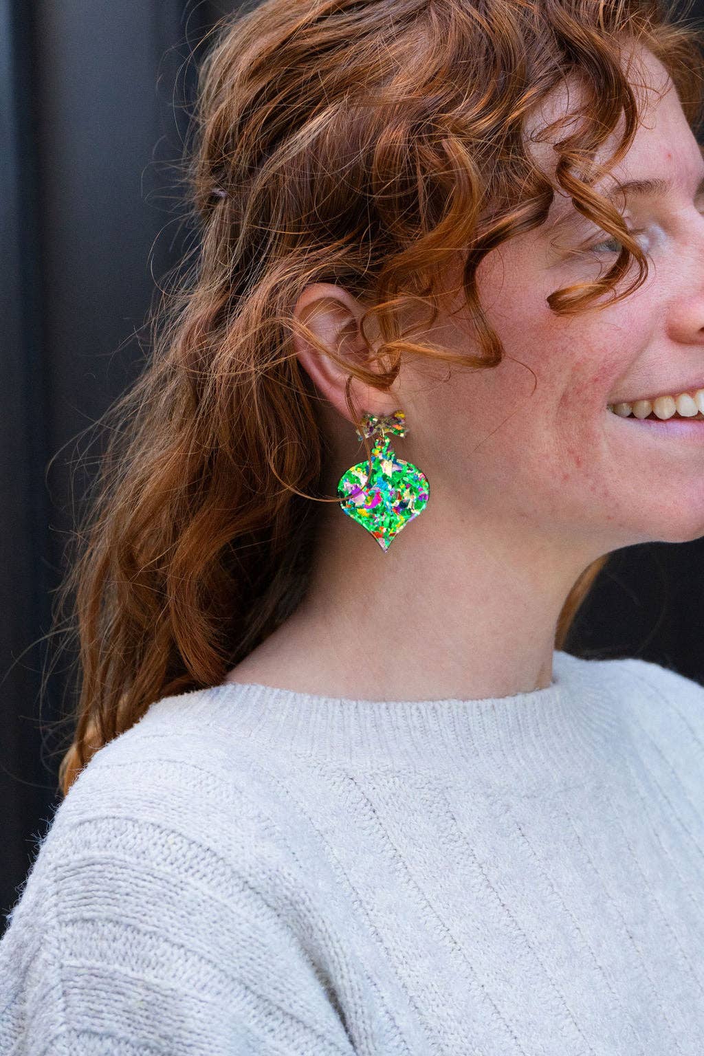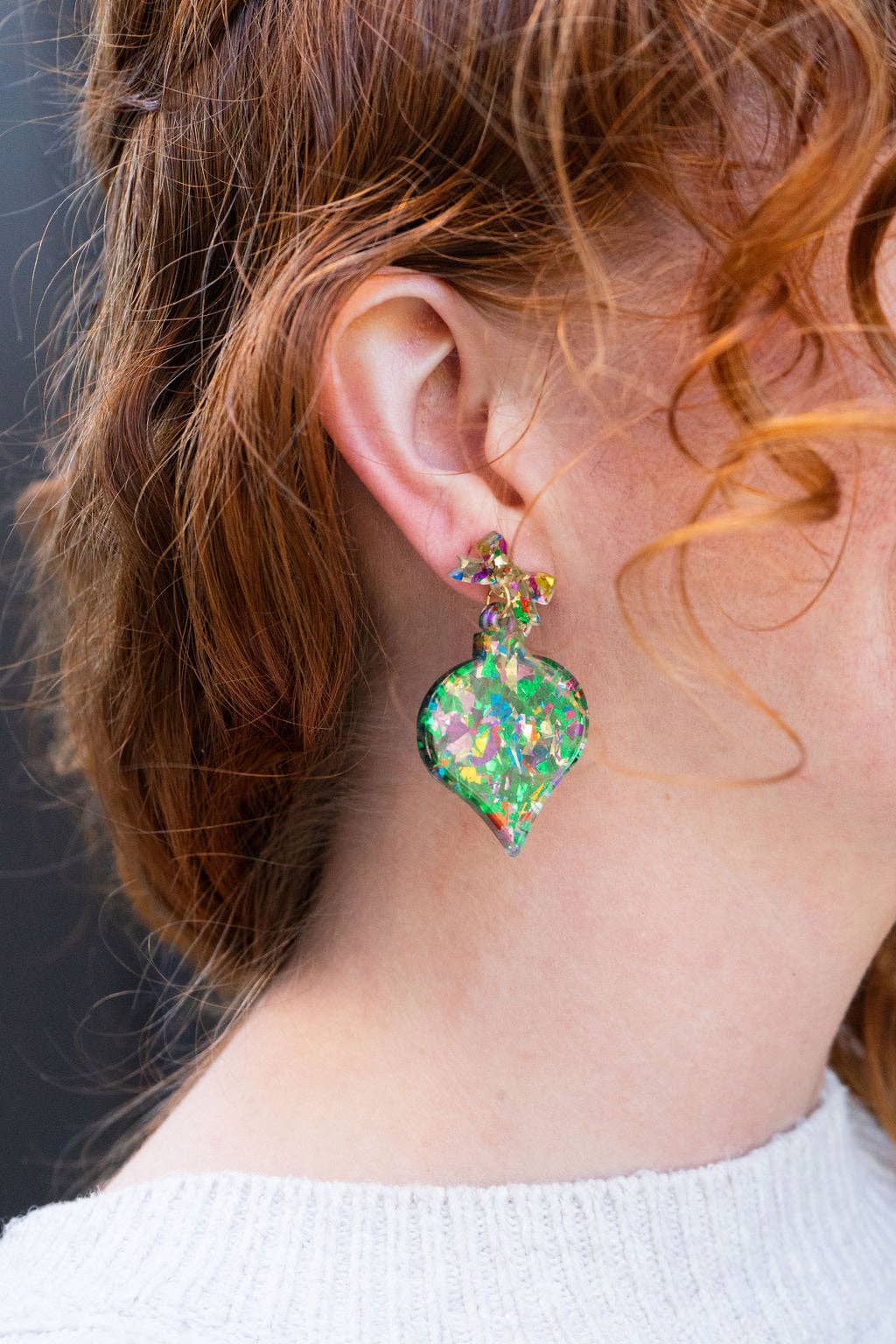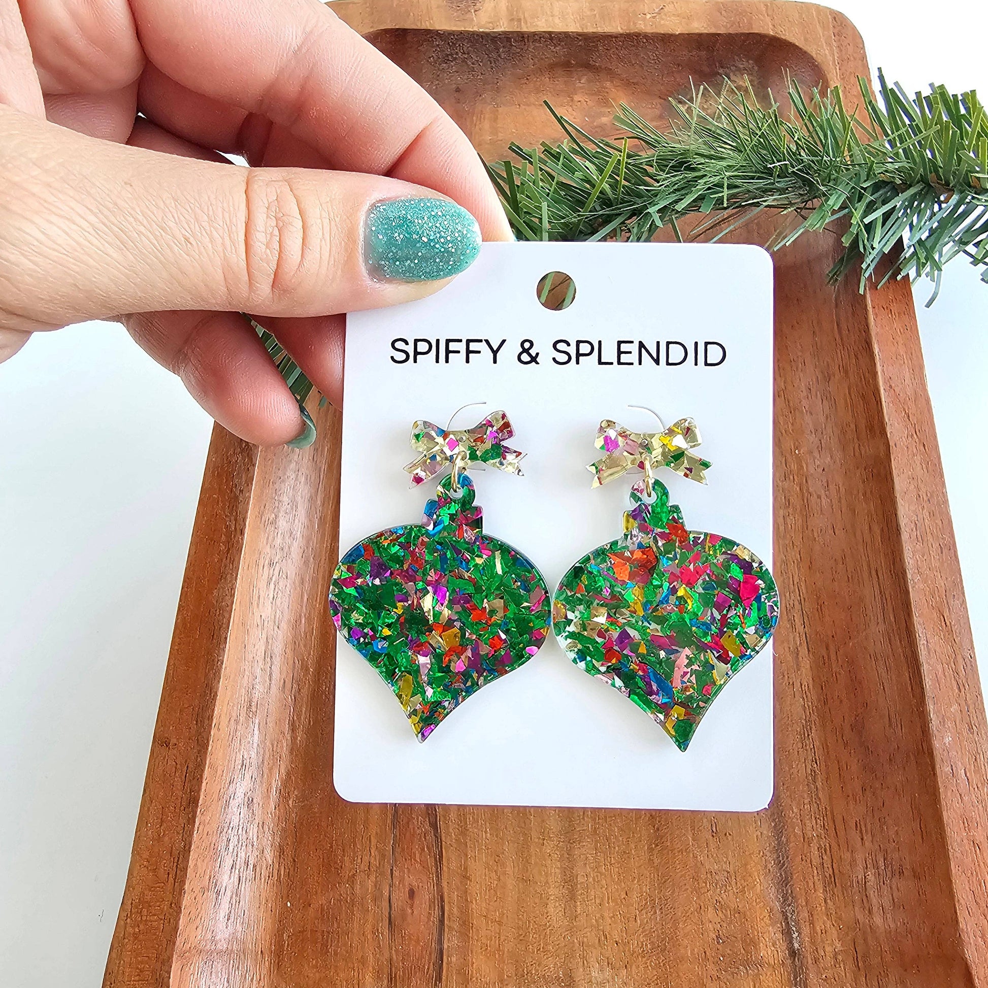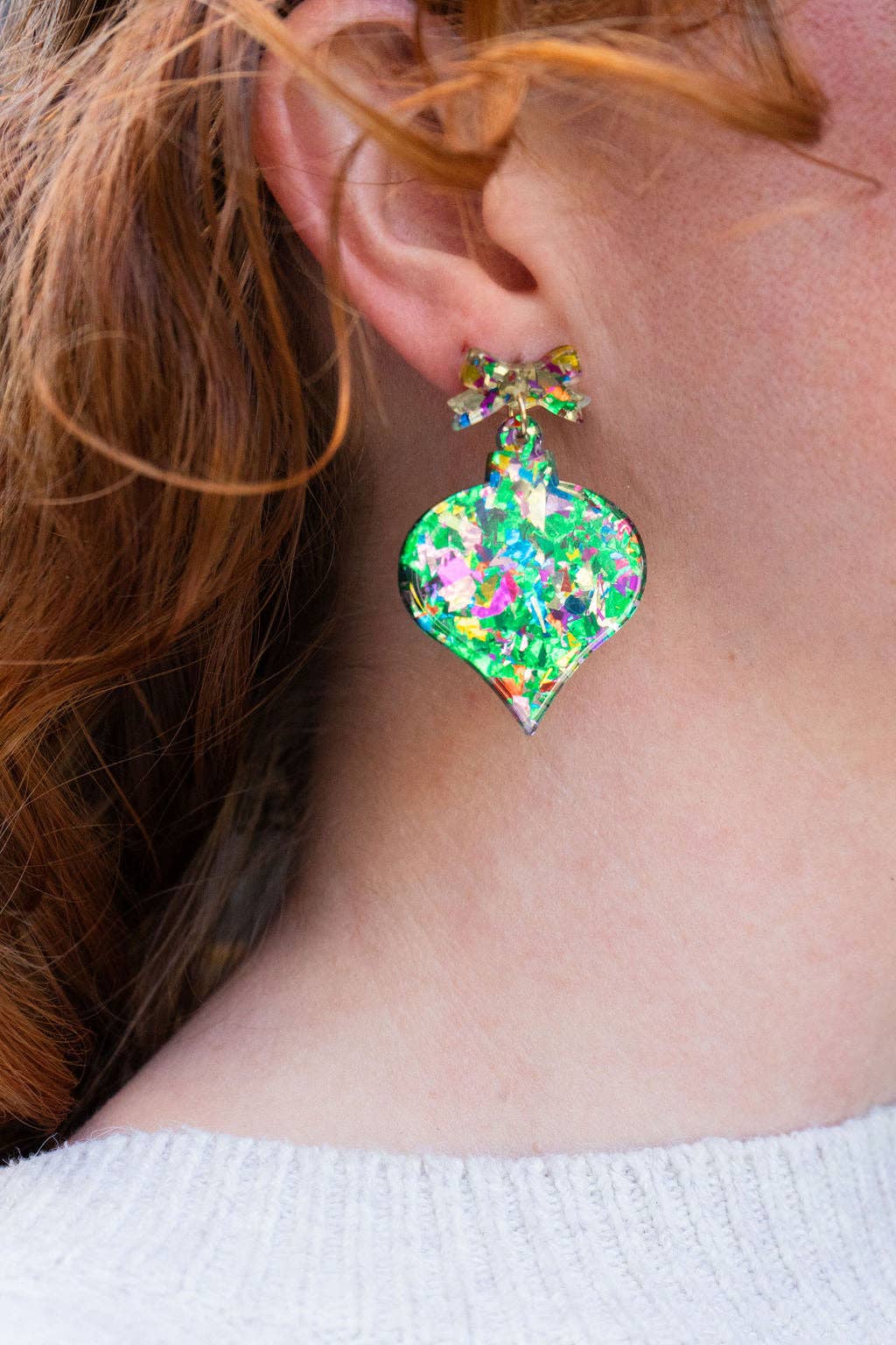 This holiday season, let your style be merry and bright with our sparkly confetti Christmas Ornament Earrings. Add a touch of sparkle to your festivities and embrace the joy of the season! 🎉🌟❄️ Our Christmas Ornaments come in three different colors and vintage-inspired shapes, adorned with a bow on top! * Hypoallergenic stainless steel posts * Lightweight acrylic