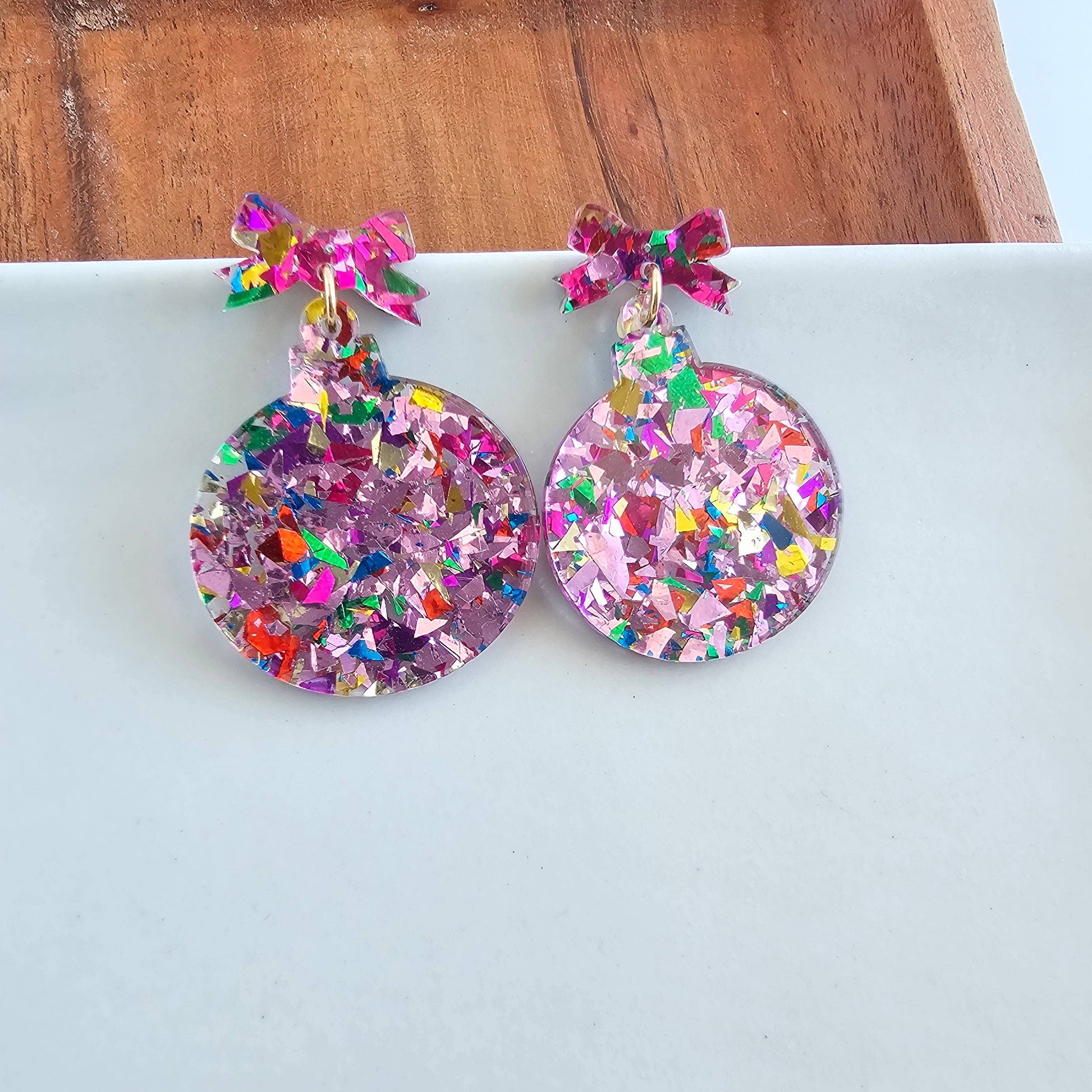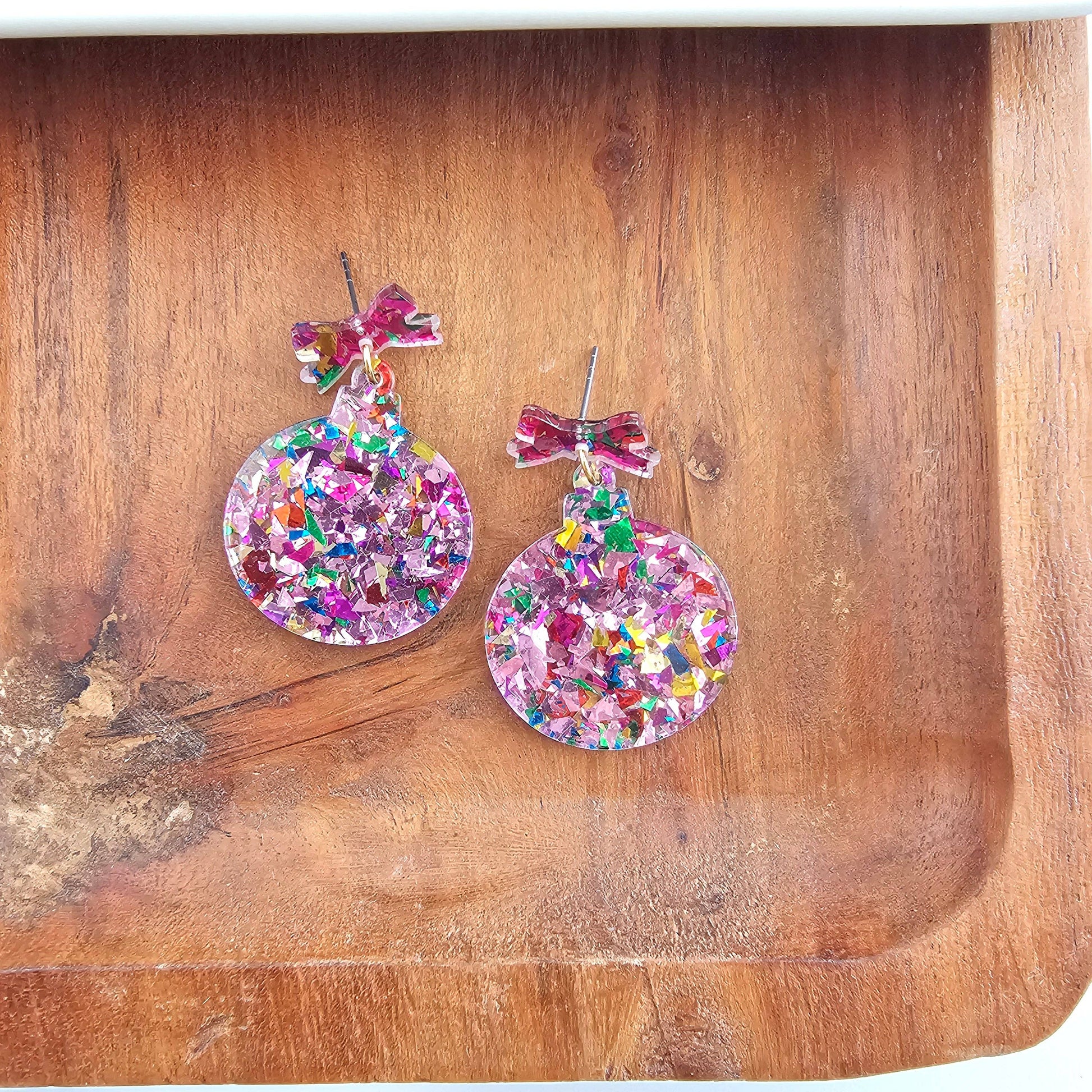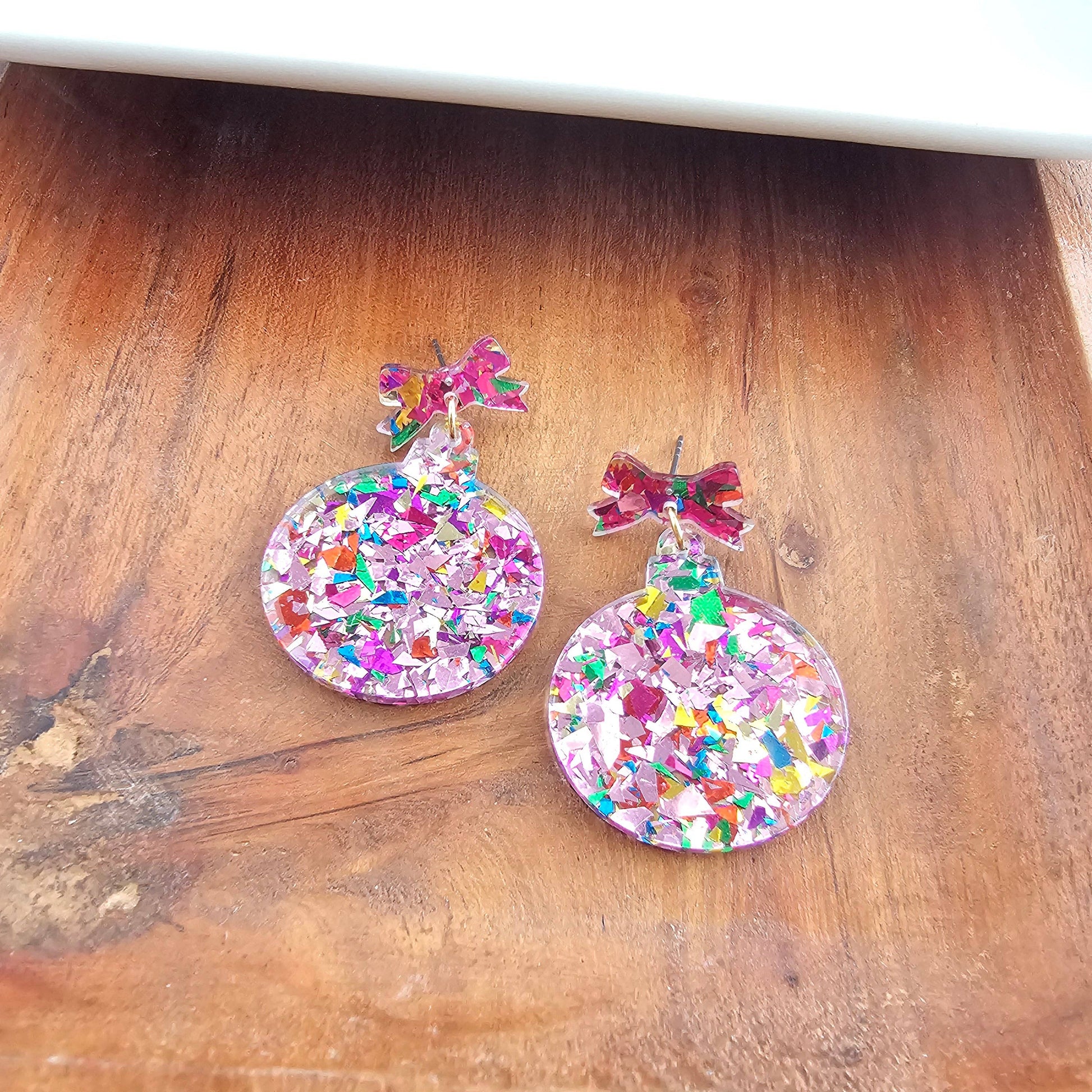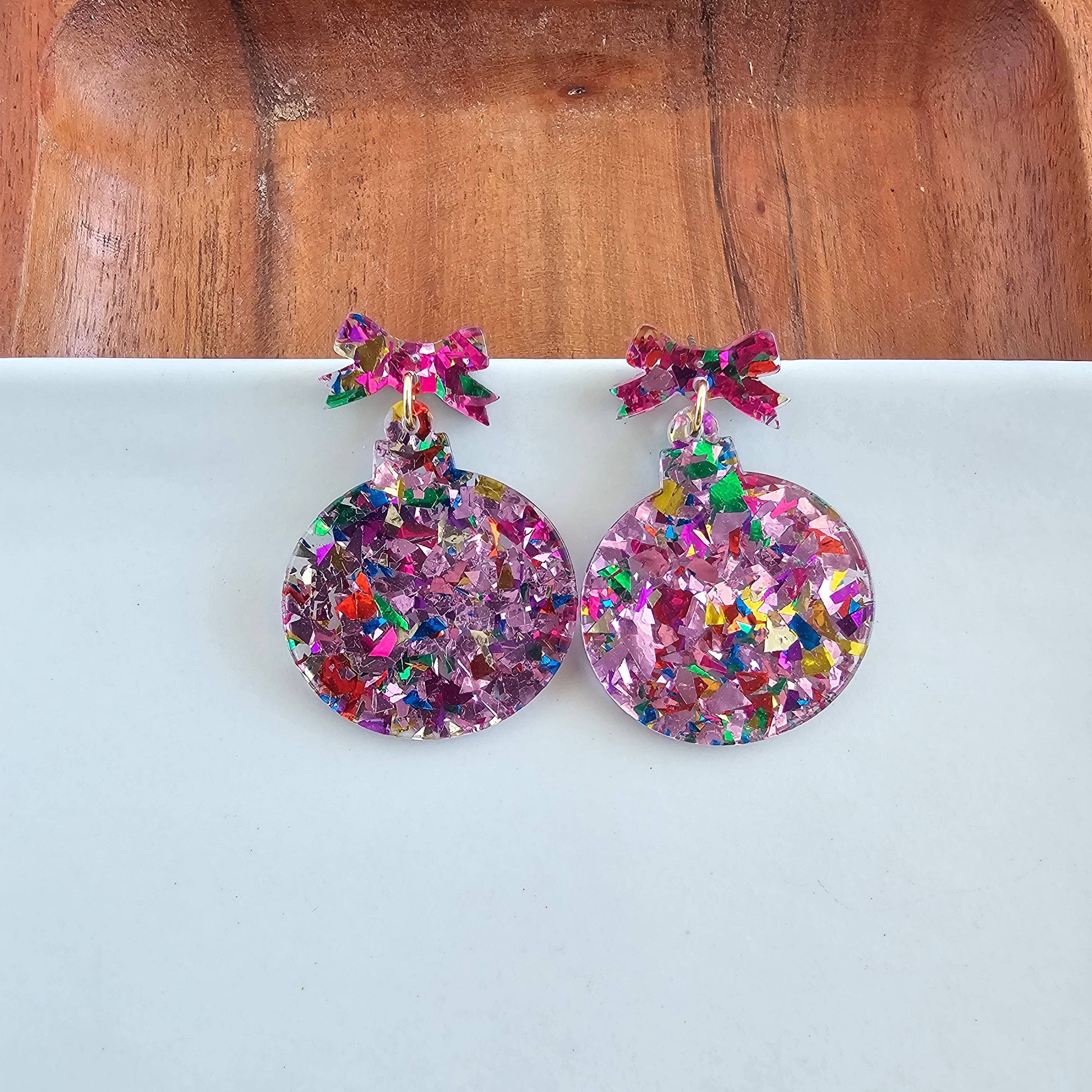 This holiday season, let your style be merry and bright with our sparkly confetti Christmas Ornament Earrings. Add a touch of sparkle to your festivities and embrace the joy of the season! 🎉🌟❄️ Our Christmas Ornaments come in three different colors and vintage-inspired shapes, adorned with a bow on top! * Hypoallergenic stainless steel posts *