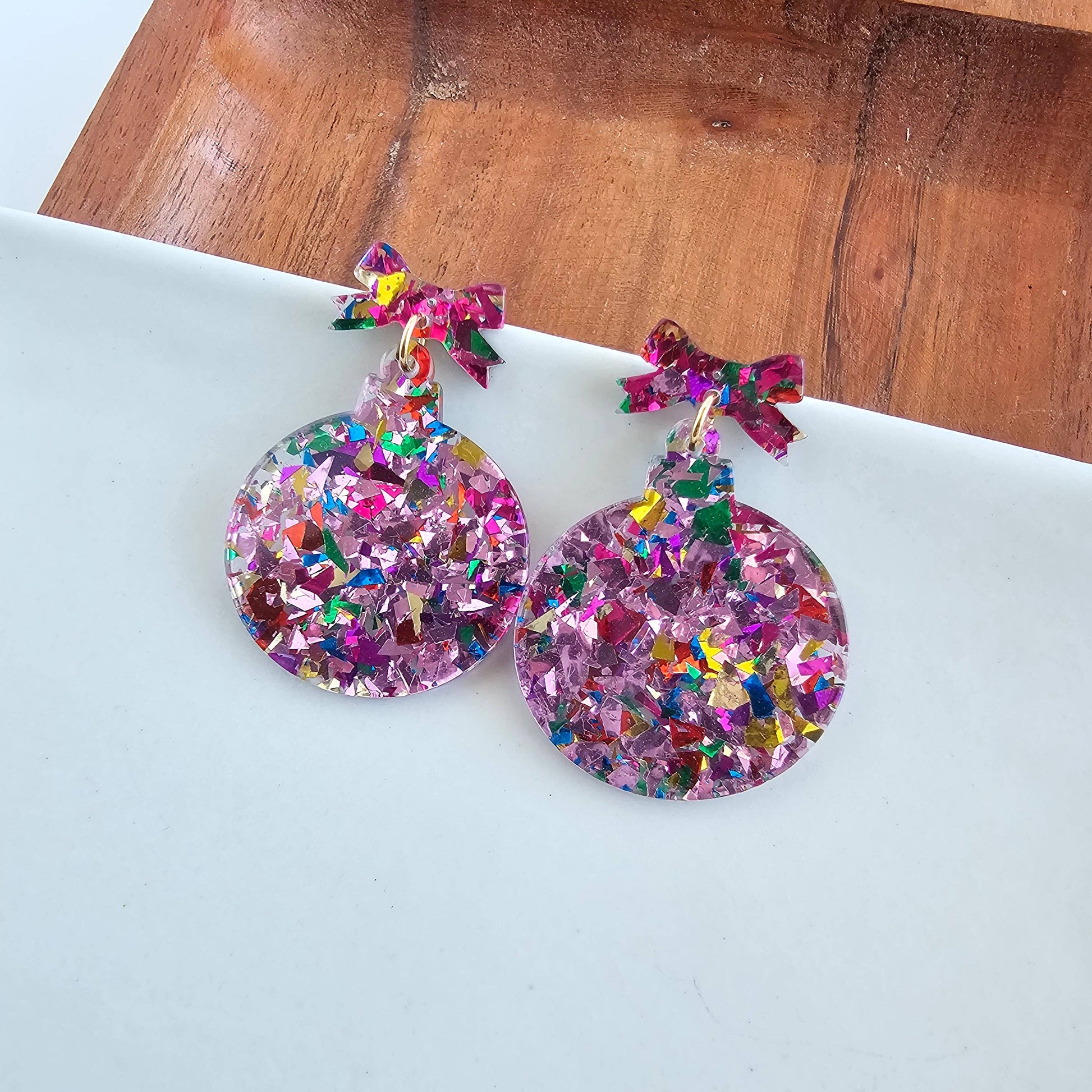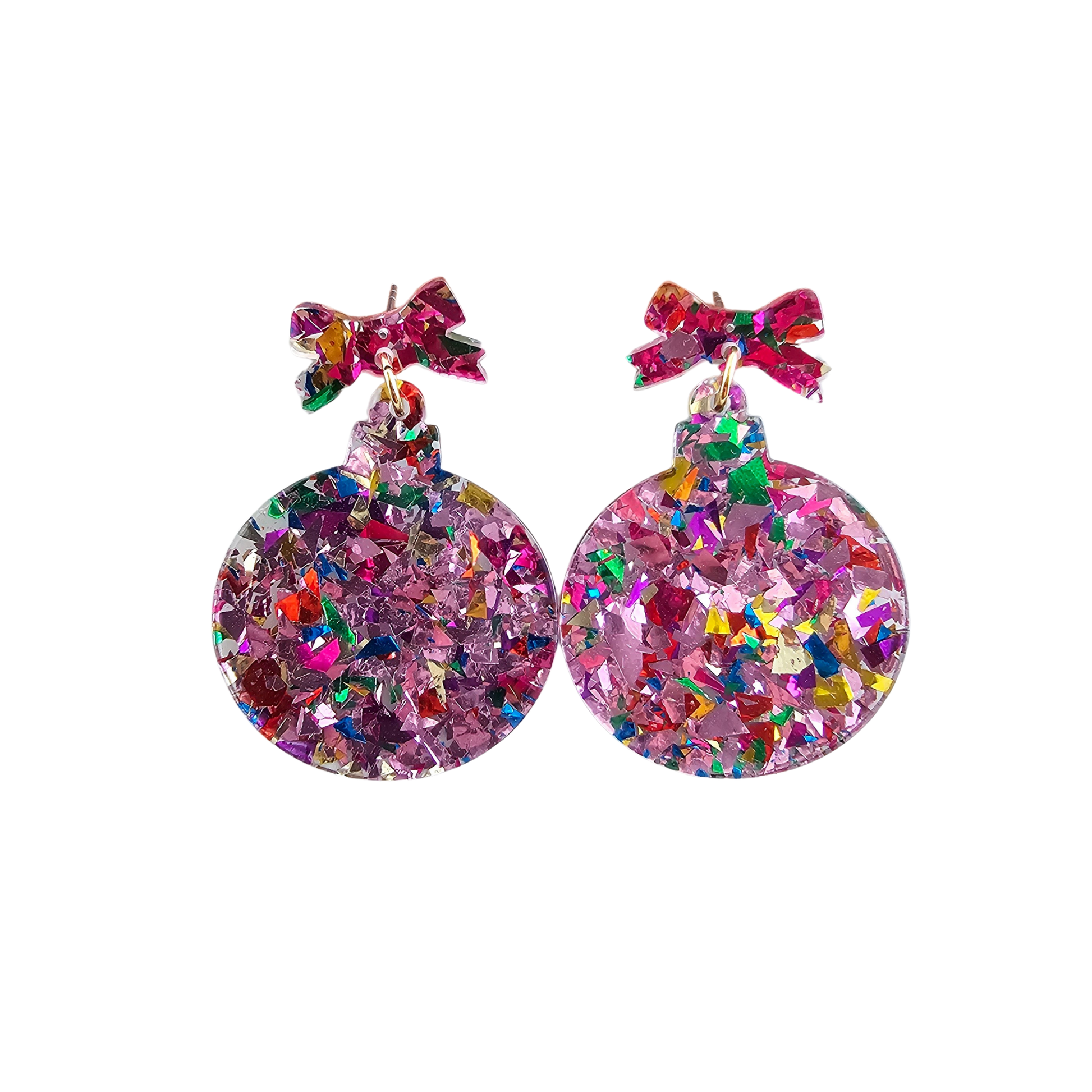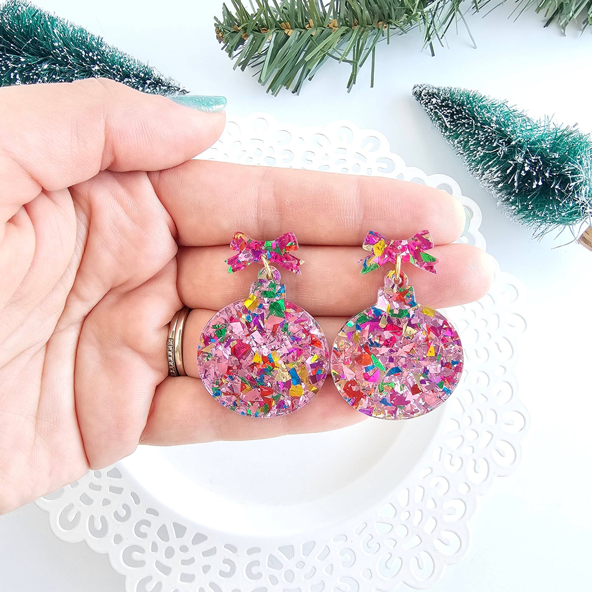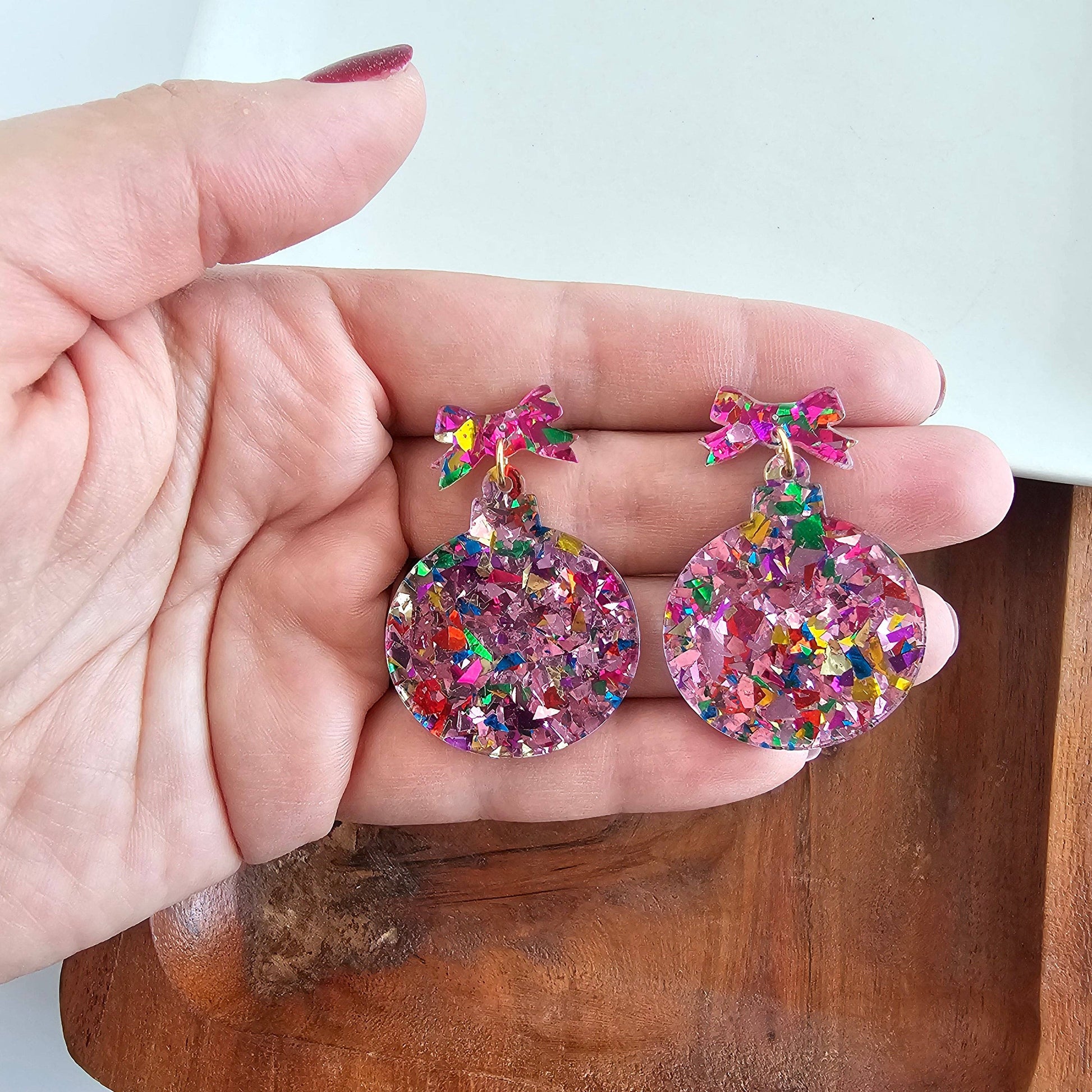 This holiday season, let your style be merry and bright with our sparkly confetti Christmas Ornament Earrings. Add a touch of sparkle to your festivities and embrace the joy of the season! 🎉🌟❄️ Our Christmas Ornaments come in three different colors and vintage-inspired shapes, adorned with a bow on top! * Hypoallergenic stainless steel posts *
