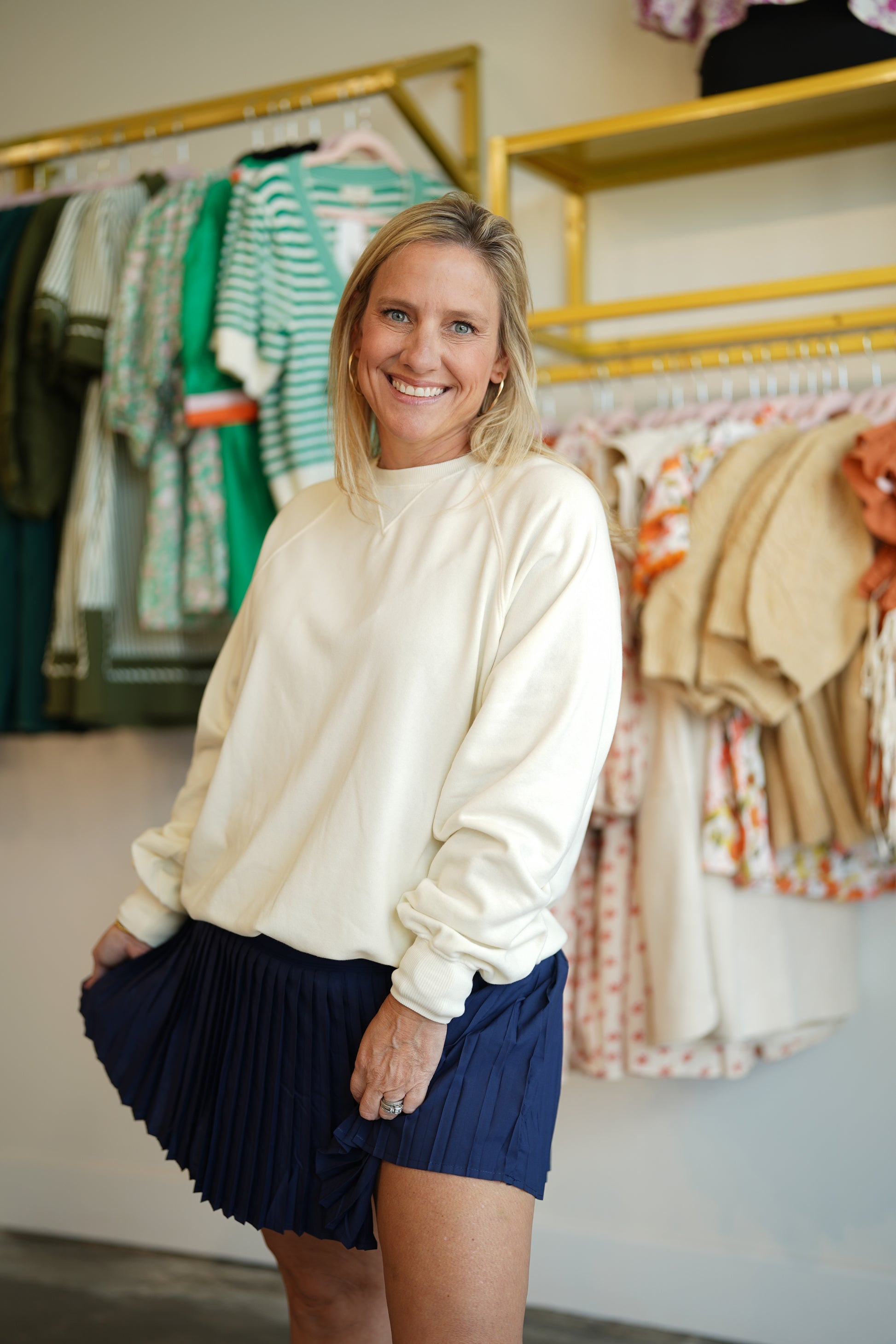 Look put together and adorable in this athletic skirt featuring accordion pleated, elastic waistband and built in shorts.