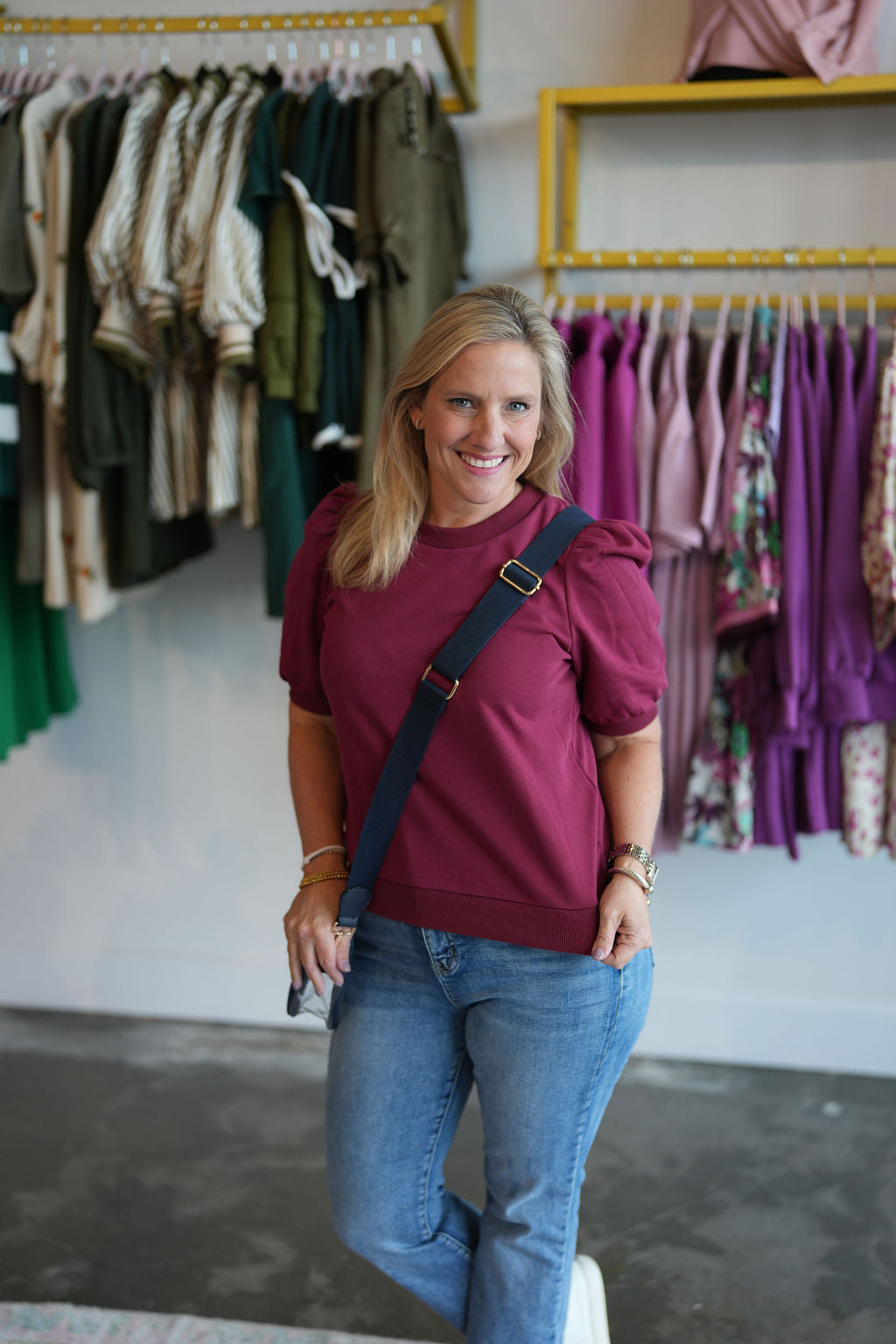 A knit top featuring a crew neckline, short puff sleeves with gathered shoulders, and ribbed cuffs and hem for a polished fit.