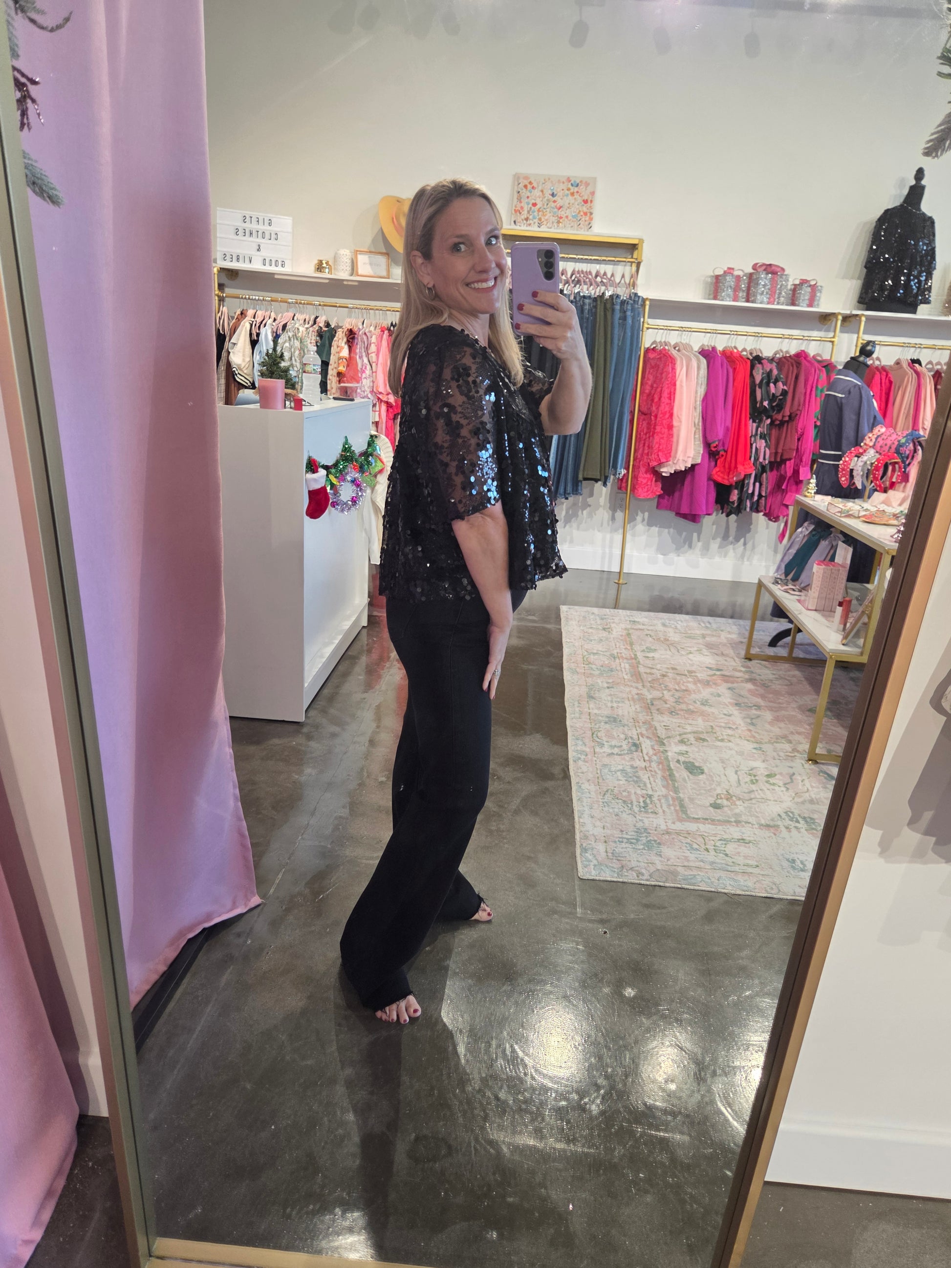 Let's celebrate anything we want in this fun top! A short-sleeve sequin top featuring an allover shimmering finish on sheer mesh fabric. Designed with a deep V-neckline and relaxed silhouette.