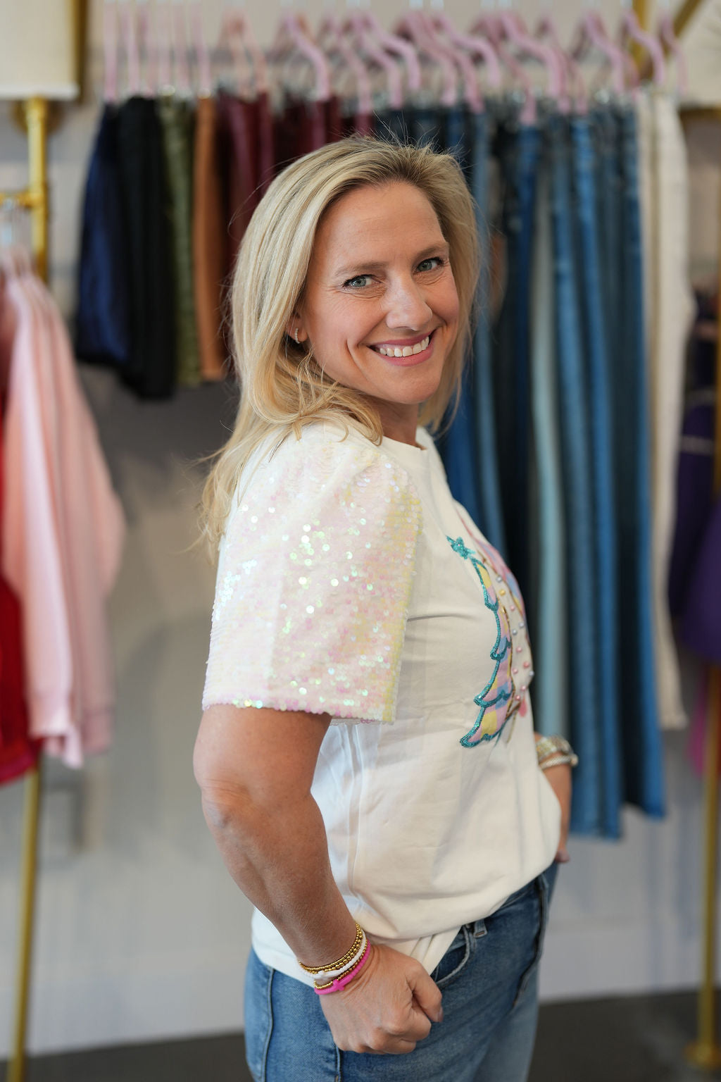 Its oversized fit provides comfort without compromising style, while the high-stretch fabric flatters your figure effortlessly. Designed with a classic crew neck, this piece stands out with sequin-adorned sleeves, fully lined to prevent any discomfort on the skin.