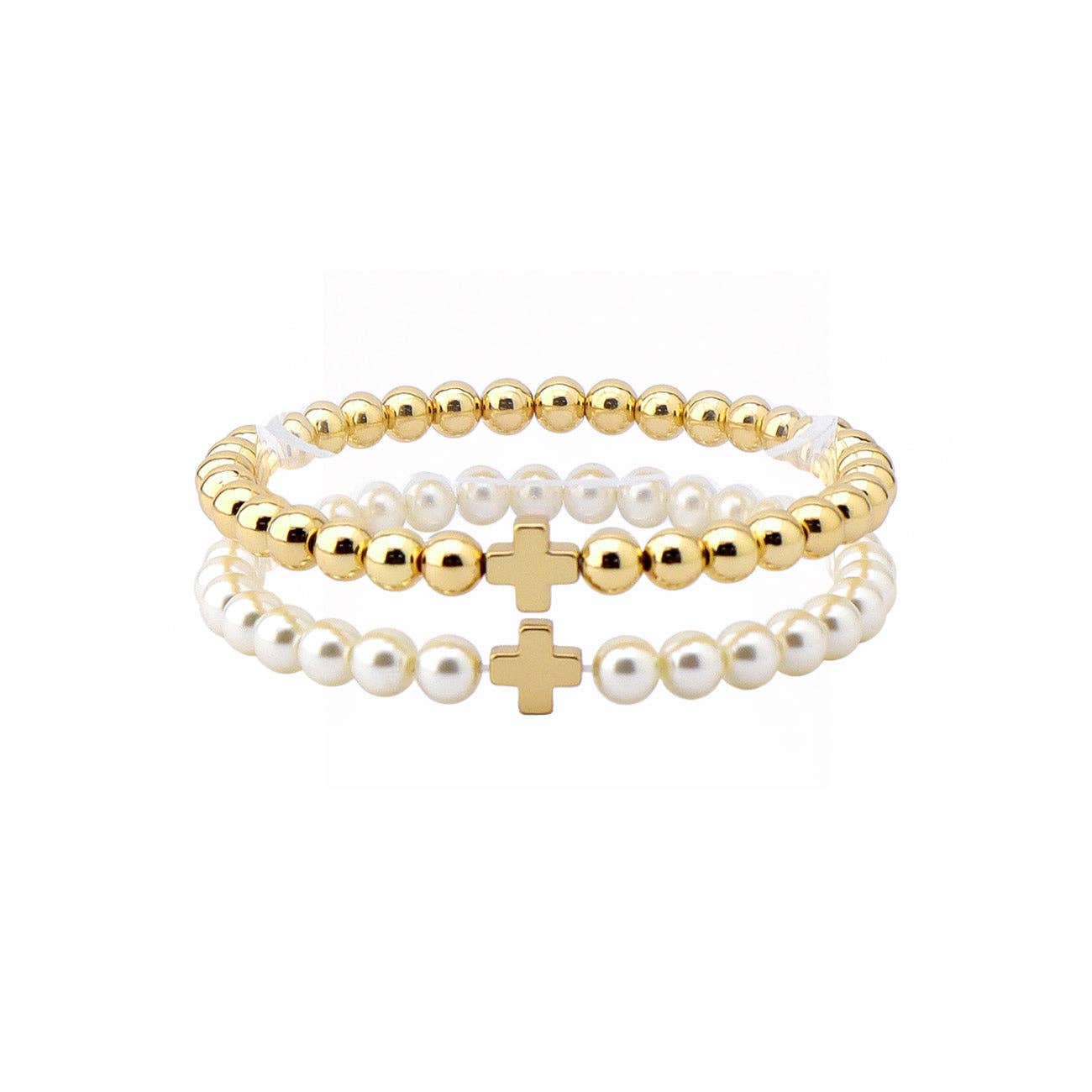 Gold and Pearl Beaded with Cross Set of 2 Stretch Bracelets