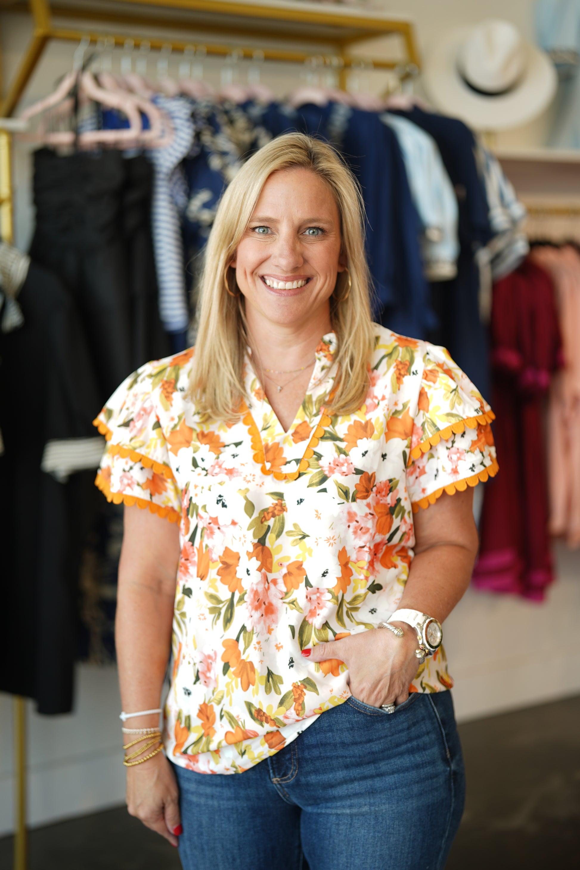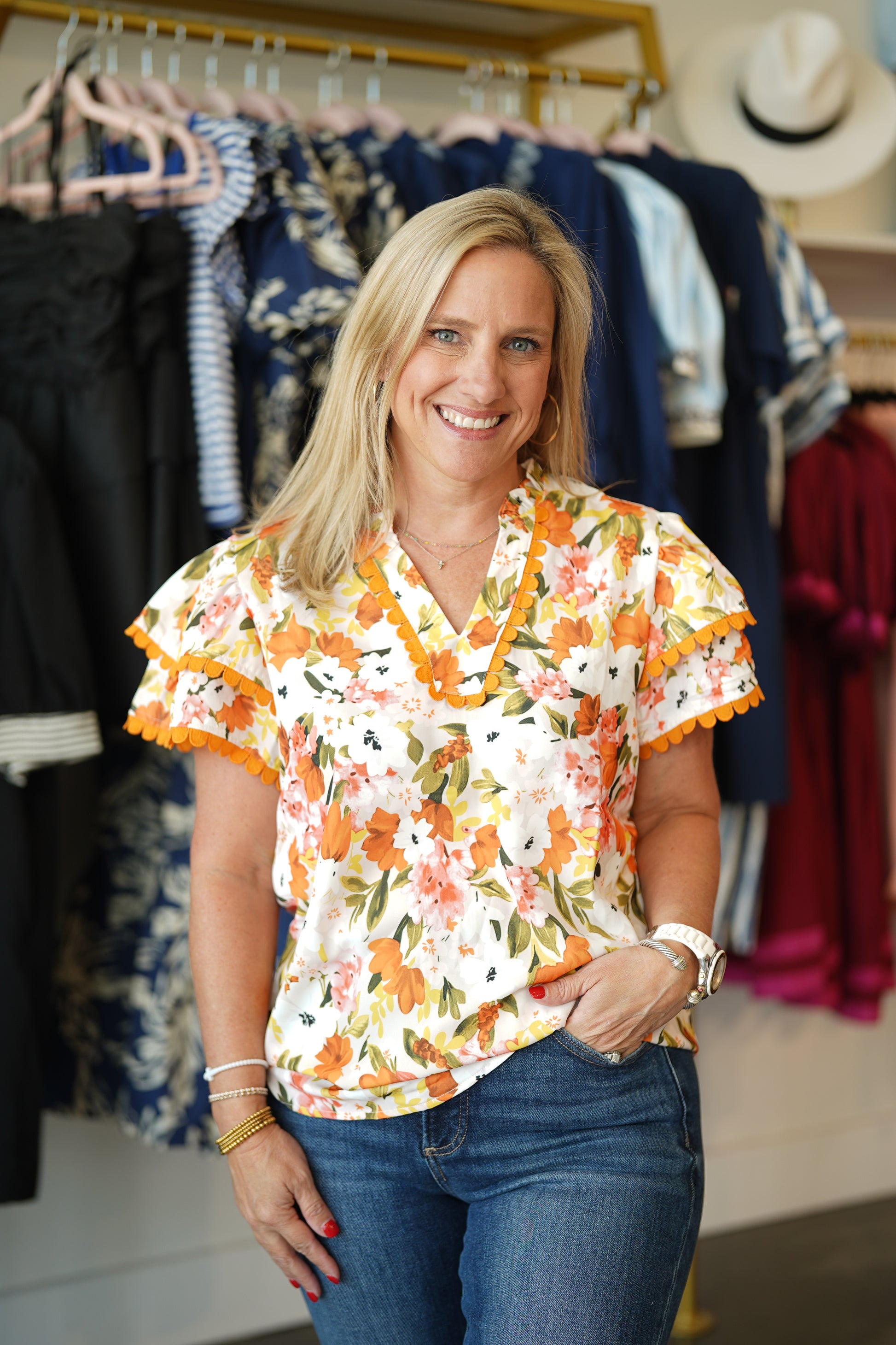 🎀 Elegant and delicate ruffled V-neck design. 🌸 Charming and unique with scalloped trim detail. 💨 Breezy and relaxed fit with short sleeves.