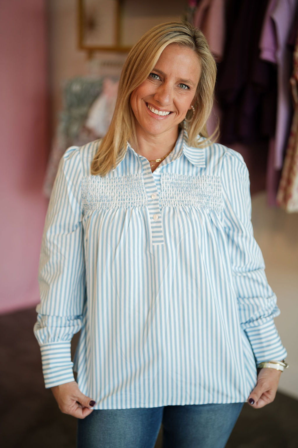 ✨ Shirred details elevate your style with elegance. 👔 Half placket adds a fresh, modern update. 👔 Collared neckline delivers timeless sophistication.