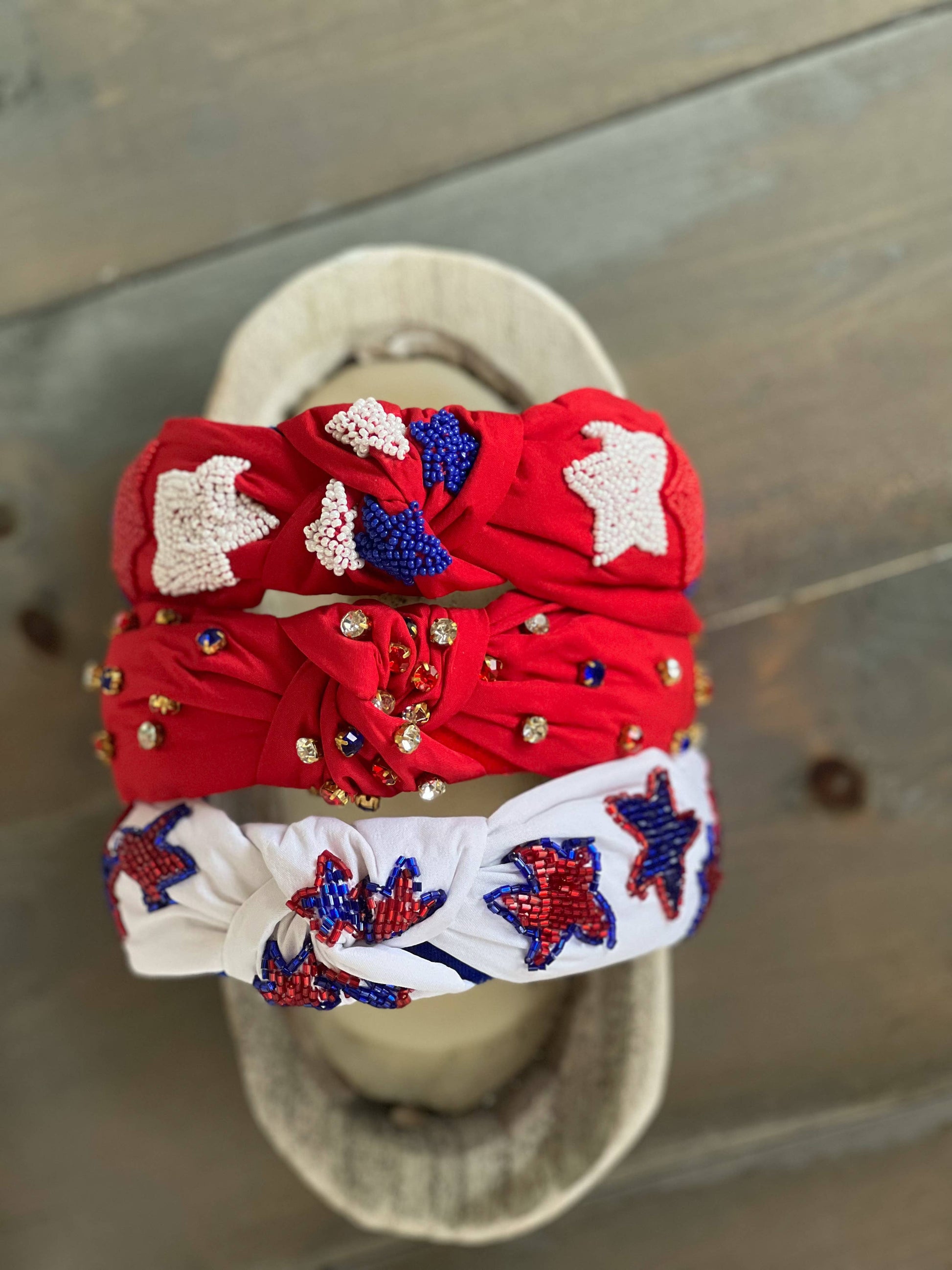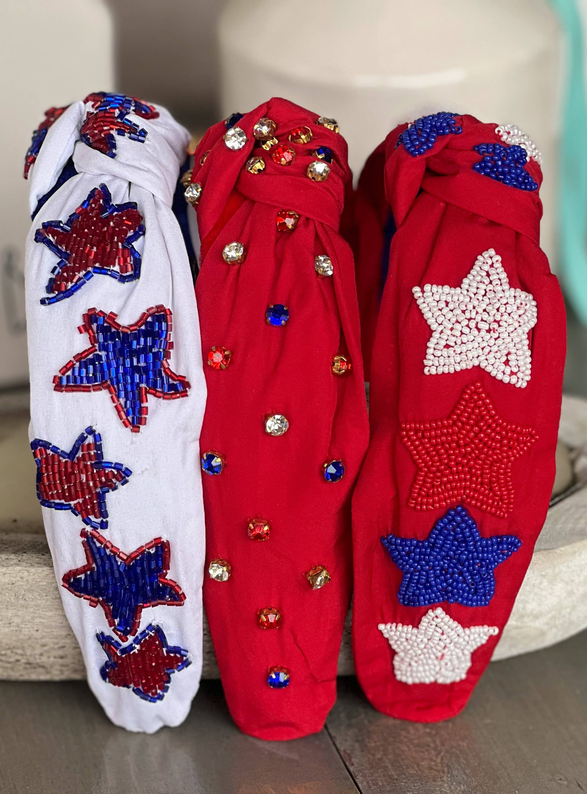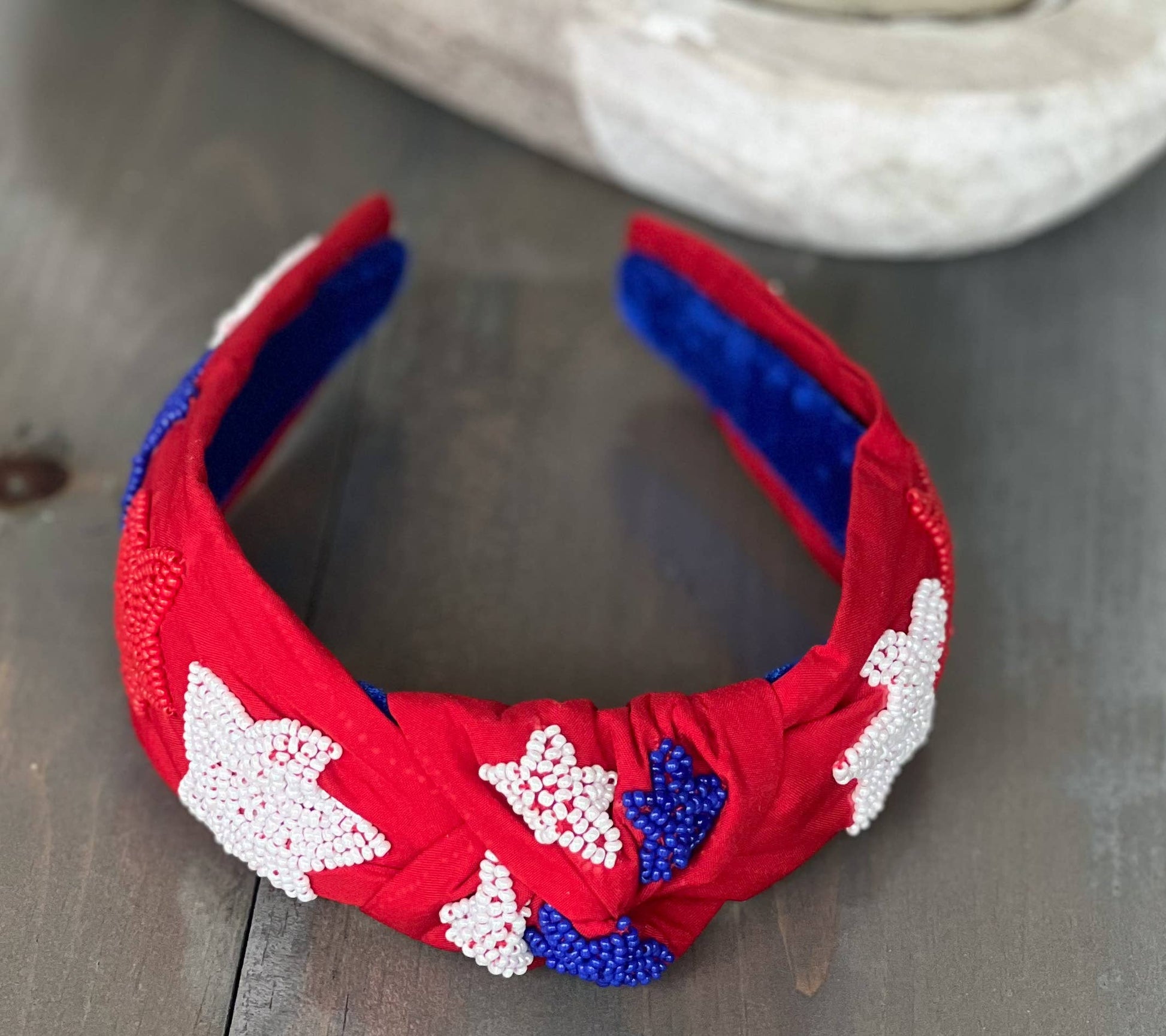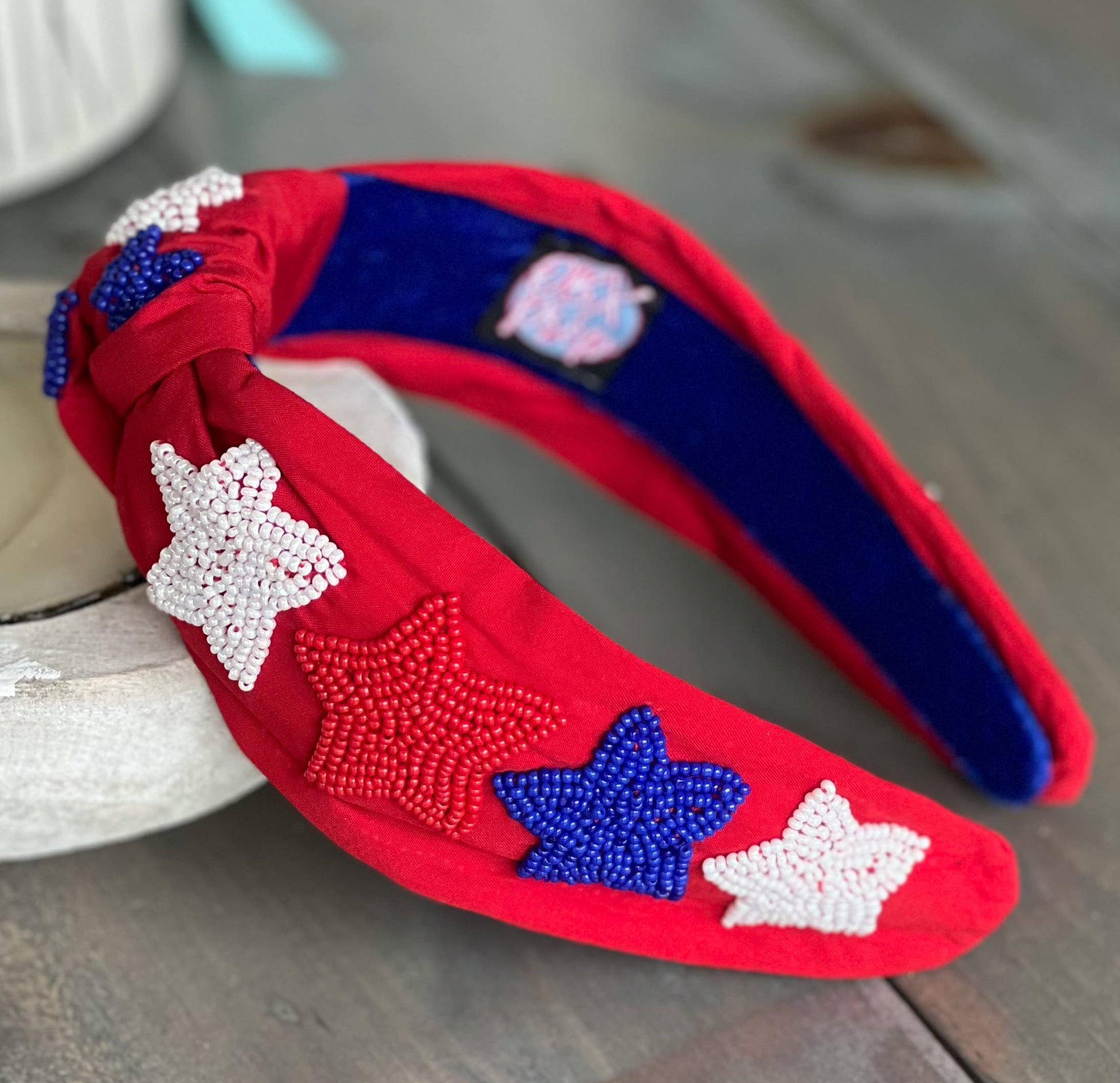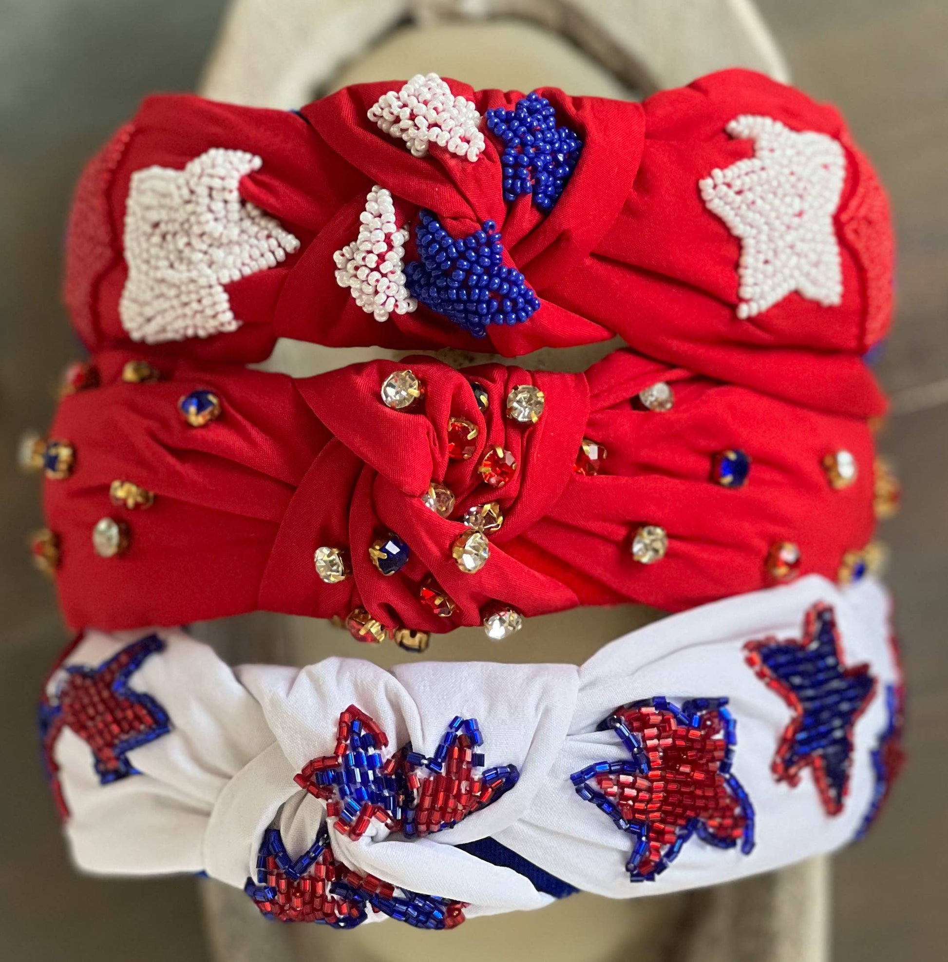 Patriotic Stars Red Seed Bead Front Knot Headband Finish off your look with our trending hand sewn seed beaded headbands. Pair them with our beautifully beaded earrings to complete your look. Hand sewn. One size. Size : 1.25"