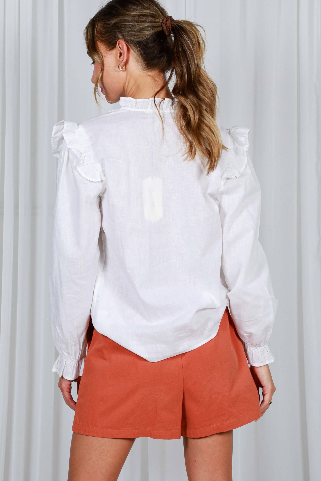 -The perfect classic ahirt for every day! Ruffled V-neck 100%Cotton solid woven blouse top - Button front closure - Special elasticized smocked front - Long puff sleeve with elasticized ruffled cuffs - Relaxed fit -