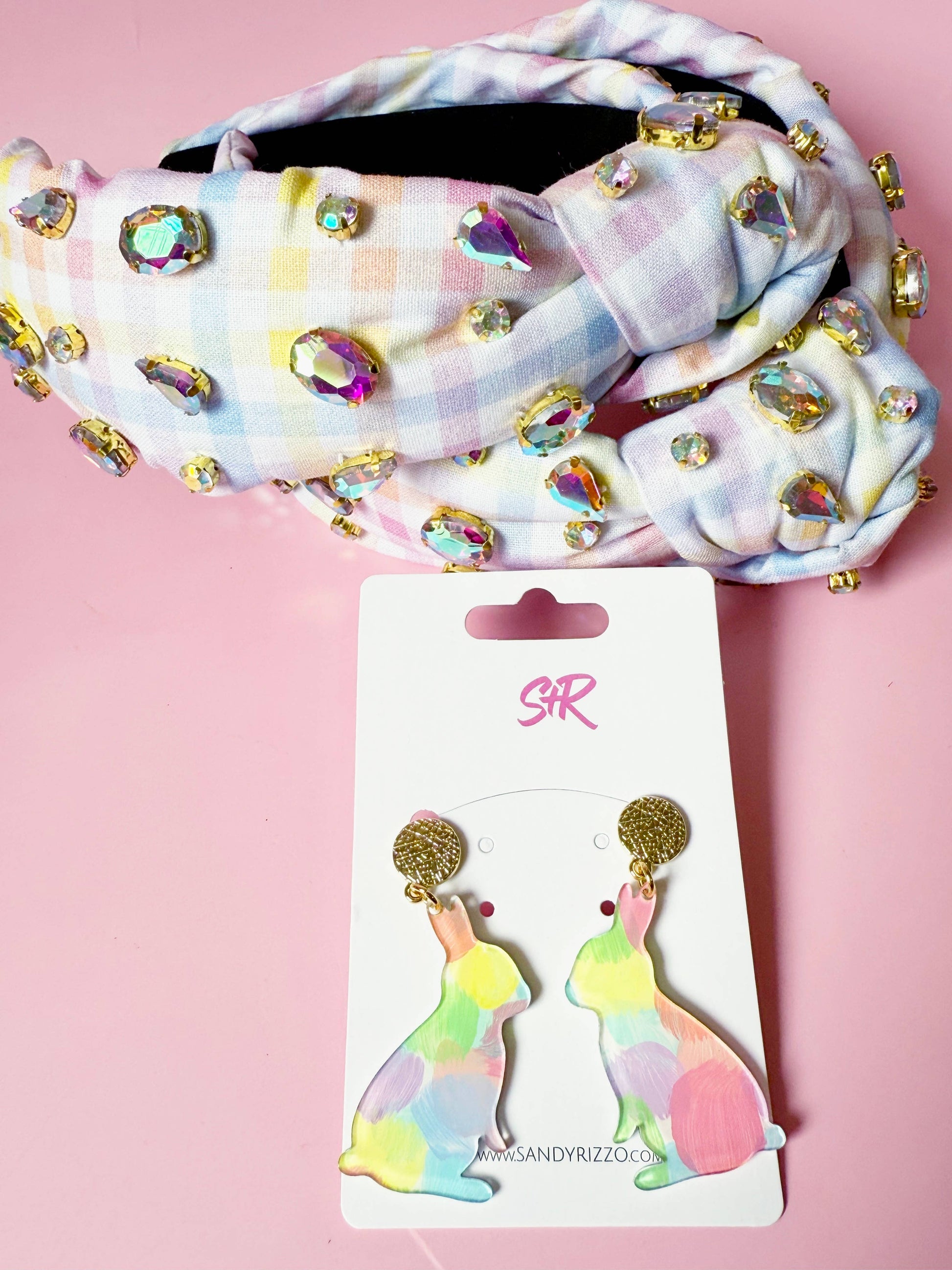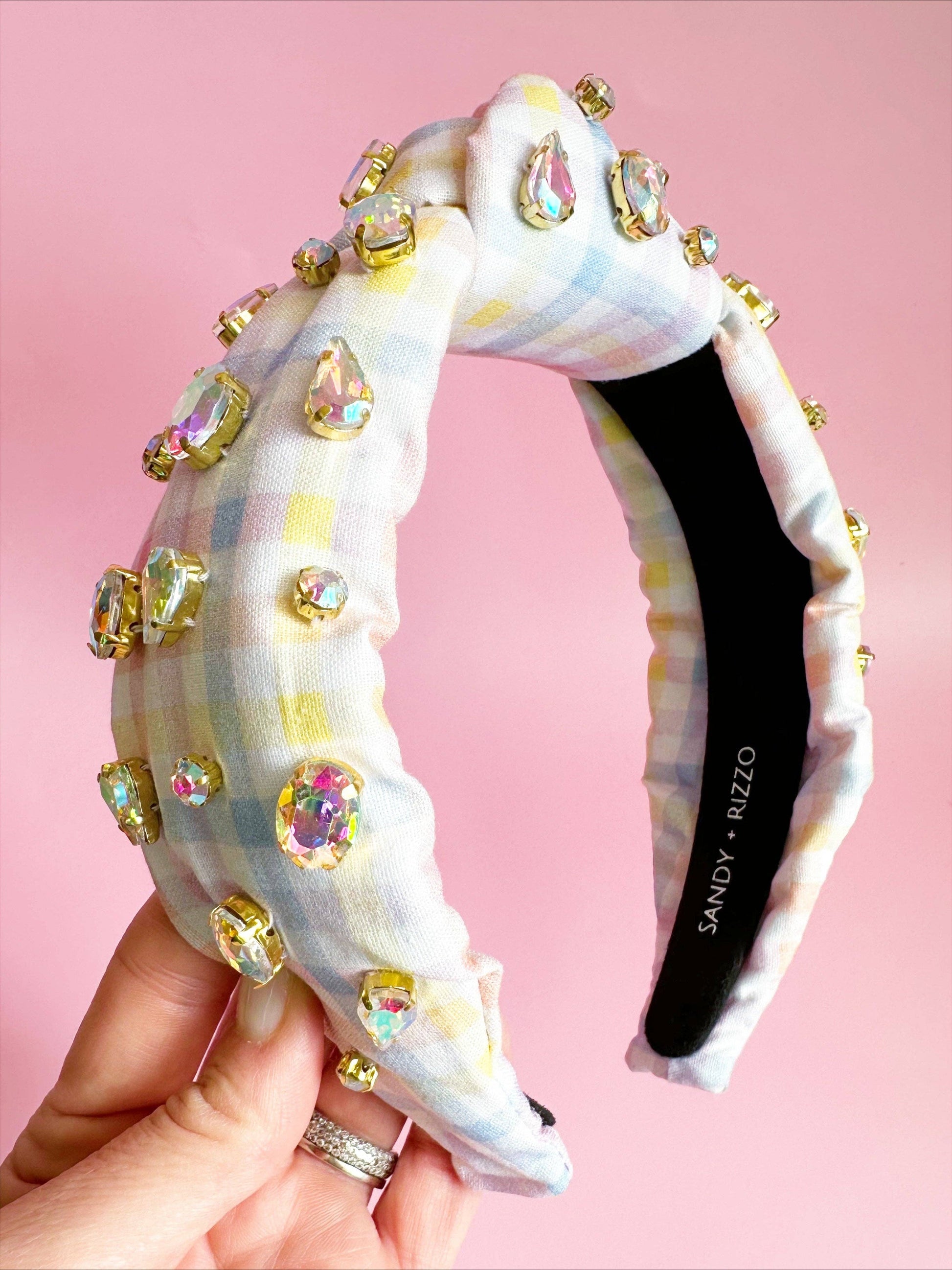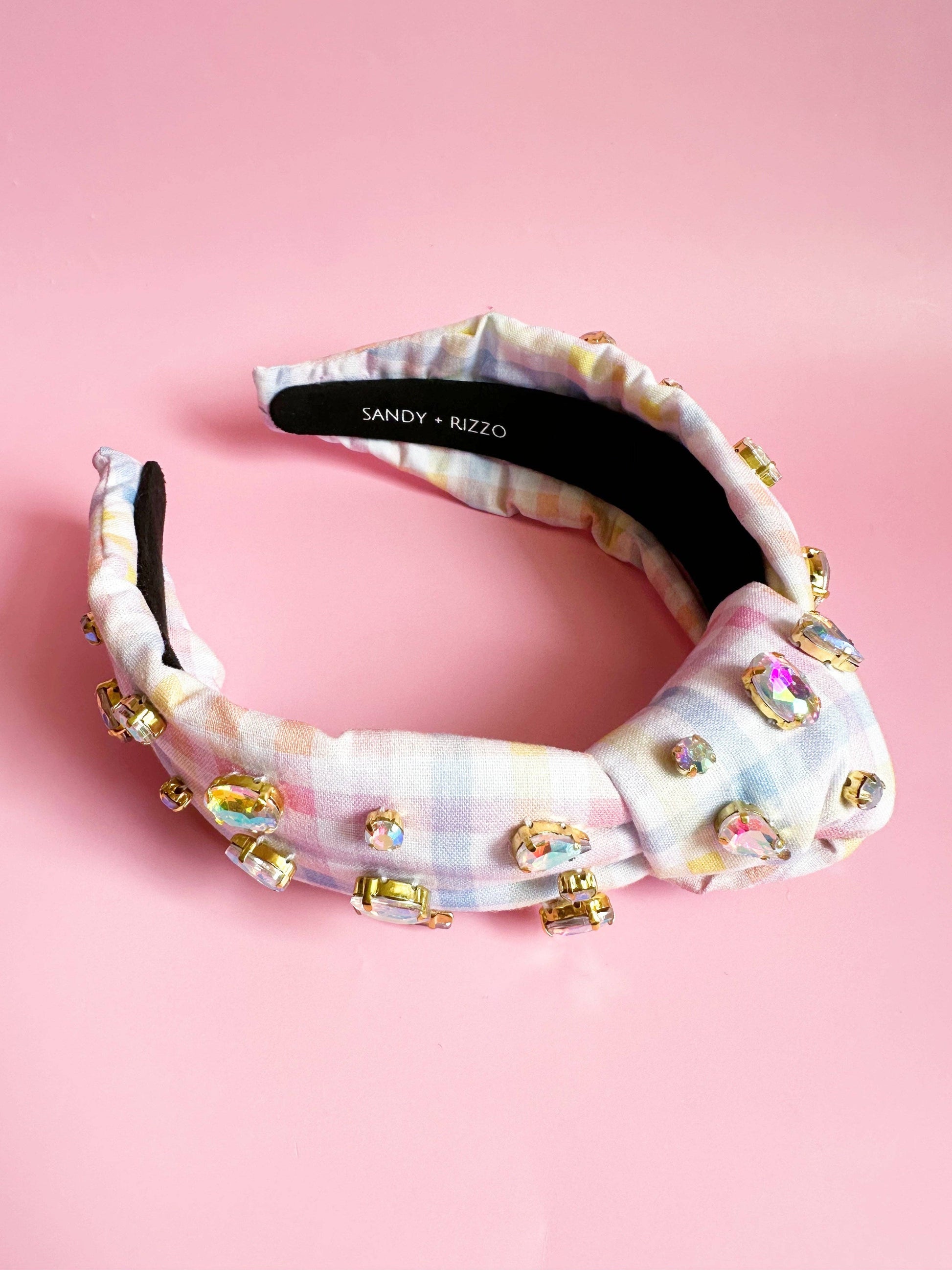 Blue, pink, yellow, and white gingham headband with iridescent gems. The perfect headband for any day.