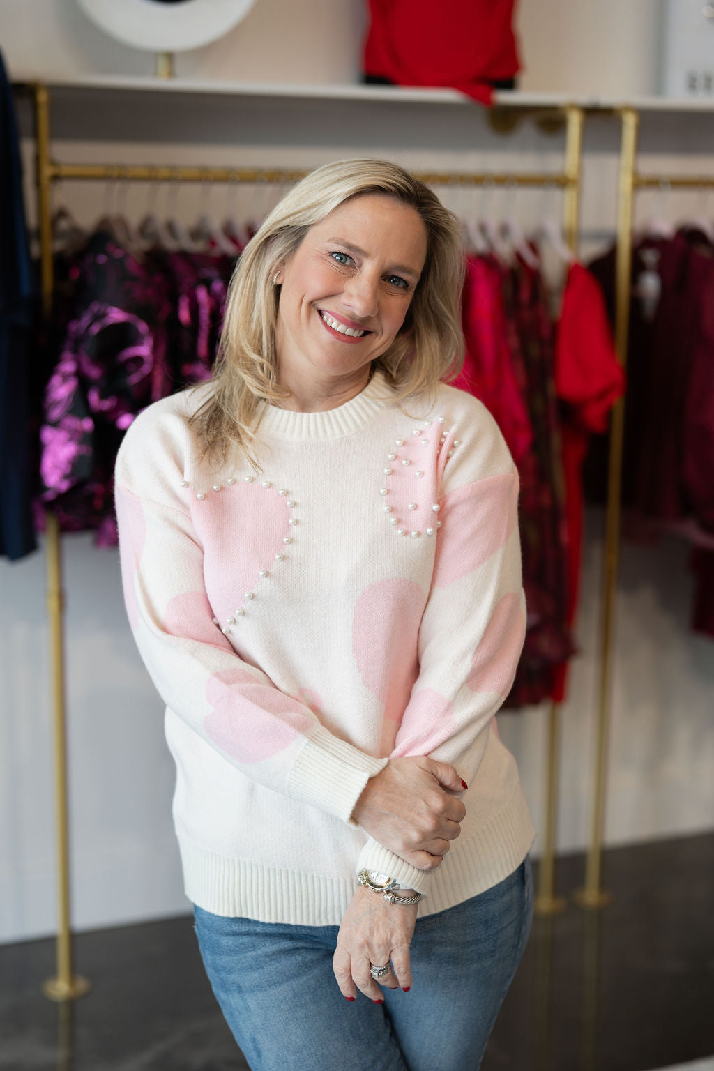 Where to wear it: Ideal for Valentine's Day parties, brunch with friends, casual Fridays at work, coffee dates, or weekend shopping trips! Style it with your favorite jeans and boots for a classic look, or pair with a skirt and flats for something a little more dressed up!