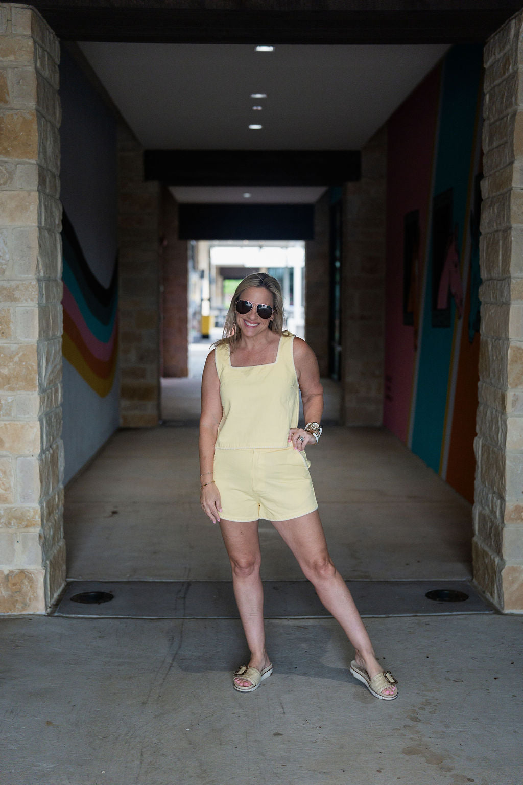Your new warm-weather go-to is yellow perfection! The Kerry Set pairs a semi-cropped denim tank with high-waist shorts, both finished with signature whipstitch trim for a polished, artisan-inspired look. The top features a square neckline, wide straps, and a back zipper, while the shorts offer a button and zipper front with elastic back and whipstitch-trimmed pockets and hem.